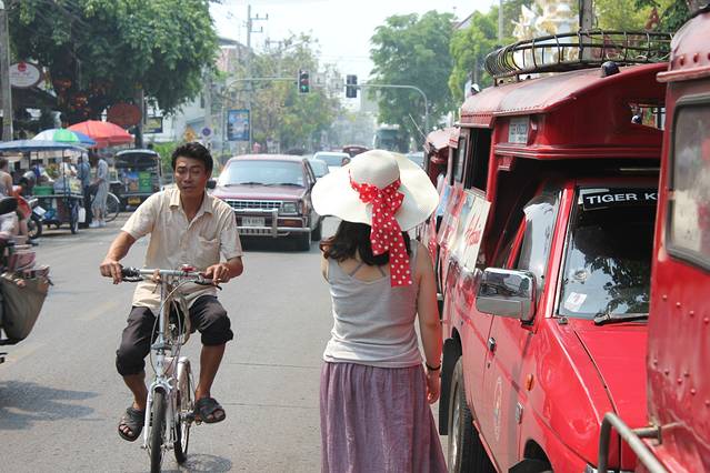 2、清迈市区交通。笔者是大力推荐自己骑摩托了,经济实惠,也很方便,吐吐和双条看到国人宰起来可狠。摩托日均消费是250泰铢,200是租车,50加油,足够了。保险我觉得是没必要,因为泰国很多修车地方,撞了稍微修一下也不费钱。特别是上素贴,湄林等,骑摩托爽得很。很多攻略提到MOTO马力大,我觉得大个毛,时速远赶不上国内的电动车,只是开始大家要稍加练习,切不可一蹴而就,看过几对夫妻摔的,当然也不严重。笔者开始都是小心翼翼用20码在湄林山间穿行,后来过蛇形弯都40以上。当然,这种交通方式是因人而异,不喜欢勿怪。清迈开车大多数都是很文明的,汽车是会主动让摩托车的(除了双条),但大家也要遵守规则,转向灯是一定别忘了打,不仅仅是为了文明,更是为了安全,你总得告诉汽车你要干嘛吧。