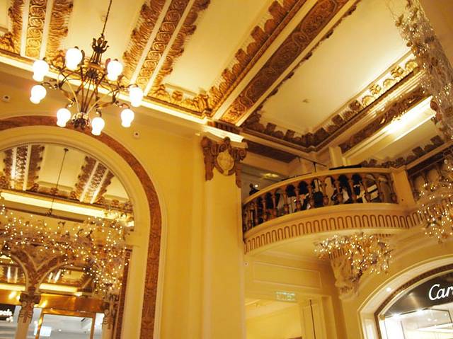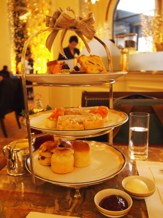 点心都是现做的,所以点单后等得有点久。共三层:下层是英式Scone,微甜,不是我和朋友爱吃的那口。中间是三明治、烟熏三文鱼,咸咸的,不错。上层是曲奇、巧克力、马卡龙。每人可以点一杯茶。朋友点的阿萨姆,自己要了芒果味的水果茶,滋味很美妙,是真正的齿颊留香。伴随着楼上乐团现场演奏的经典乐曲,气氛,醉了。
