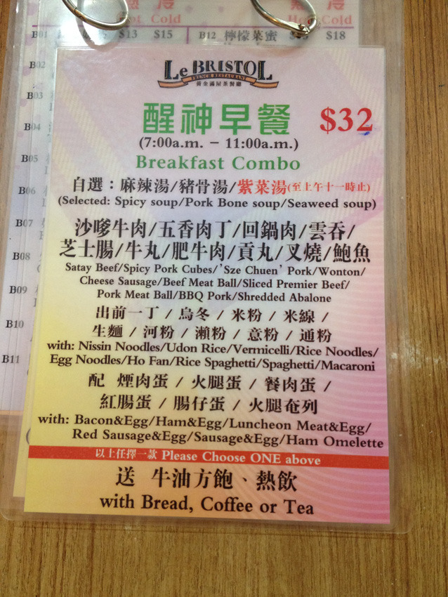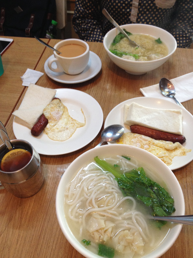 我选了猪骨汤、云吞、米线、肠仔蛋、牛油方包、热柠茶。