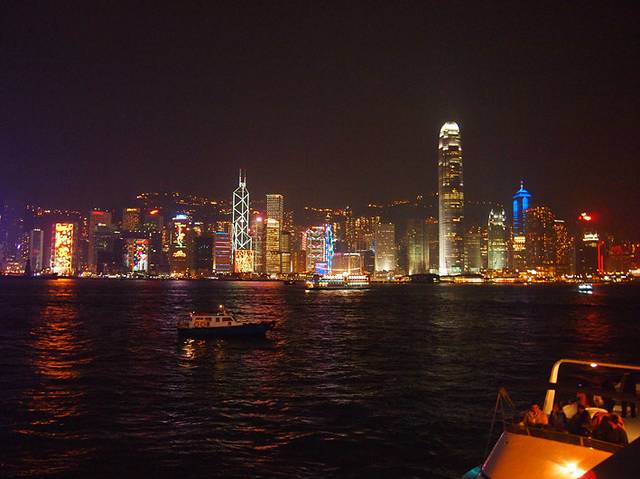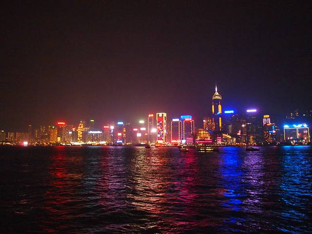 之后搭八点的天星小轮过海看幻彩咏香江。在渡轮的过程中灯光秀已经开始,虽然走上钟楼的天桥只看到最后2分钟。然而,灯光交错,相互辉映的情景还是把我们给震撼了。我们的口中只会发出哇哇哇的赞叹声,如此让人沉醉的景色有什么理由可以让人不爱上香港呢?