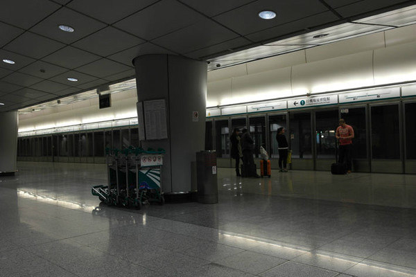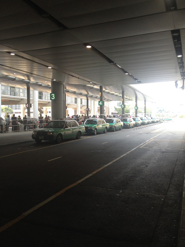 这里提一下香港机场的士站,规划得非常清楚。一共3条道,分别是红色、绿色、蓝色的士。每个区域的指示牌也用相同的颜色划分,一目了然。我们搭的蓝色的士车辆非常少,必须得有足够的耐心。
