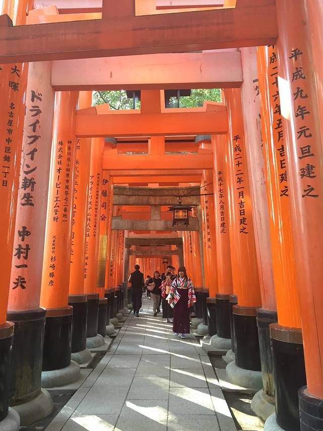 因为章子怡的《艺妓回忆录》,其中有一段子怡同学奔跑的过程,就是在伏见稻荷大社里的千鸟居拍的,不知道是不是因为这个原因,在这里遇见的中国游客特别多。不过千鸟居的大红色拍照还是很有气势的,加上伏见稻荷供奉的稻米之神的那只大狐狸,也是挺招人待见的,所以总的来说这个景点是京都不可错过的景点之一。