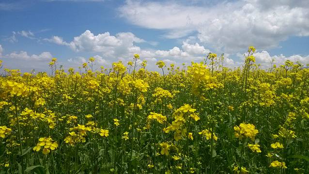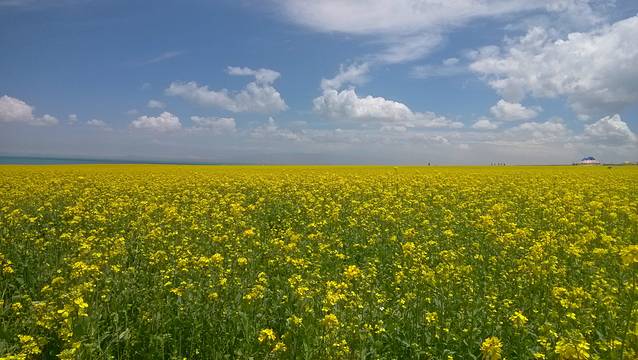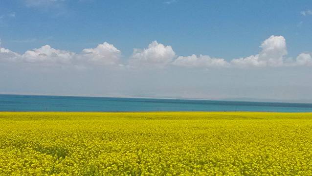 8月2日,赶往青海湖,一直阴天,期盼太阳赶快出来,天真的渐渐放晴了,可见蓝天白云。快到湖边时,一片片油菜花映入眼帘