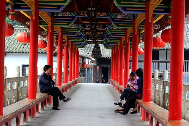 我们打算在青木川待两天,第二天,我们起床去吃早餐,发现镇上应该有喜事,但走了两圈都没有见到在哪里……我们去了魏氏故宅,后来天空飘起了小雨,我们坐在飞凤桥下发呆卖萌……桥上稀稀拉拉的坐着当地居民,还有可爱的小朋友~