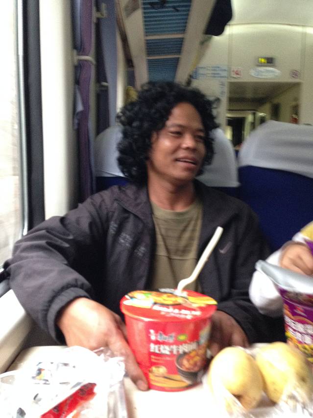 火车上人没有想象中多,我对面坐了一位很有异域特色的大哥,他所有的行李就是一个水桶,里面放着层层叠叠的衣服和一大堆食品。大哥要坐车到西昌,路途遥远。大哥很腼腆,一路上和我谈话不多,但是很爱笑,在我身旁不远处是一对母子,母亲连背带抱一共有三个孩子,最小的还在襁褓之中,这节车厢有很多小婴儿,因此在半夜时分,有一个孩子惊醒后啼哭,带动着整节车厢都在啼哭……