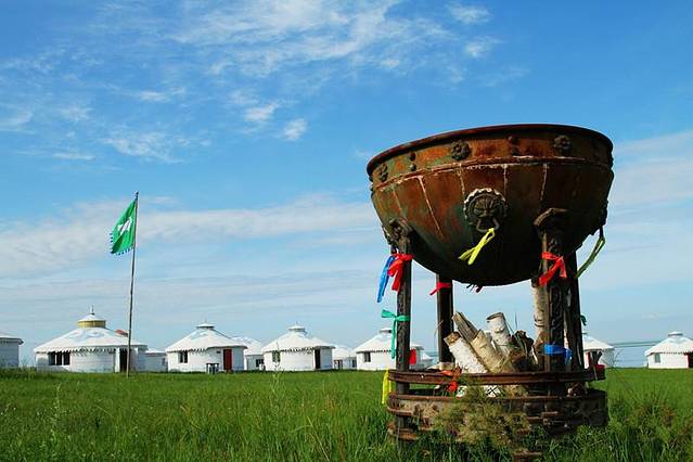 我们第一站去了莫日格勒河,说这里是老舍笔下的天下第一曲水,看过之后才觉得果然是曲啊,天然形成的百转千回的河水也不知在这里流淌了多少个百年。蒙古大营让我十分新奇,这趟出来不知怎么的就成了好奇宝宝,对没见过的东西都好奇,话说回来,这蓝天白云大草原和这蒙古包牛羊群蒙古族下马酒确实都是之前在电视里才能看到的。