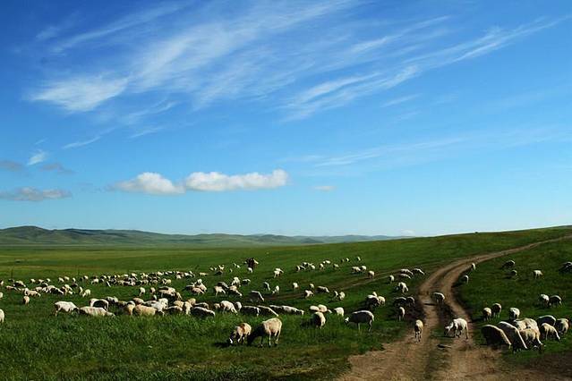 第二天一早出发,商务车一路向草原奔走!一出城满眼的绿意盎然,一望无尽的大草原点缀着闲散漫步的牛羊,空气中没有城市的污浊,有的是植物的甜腻,大片温暖的阳光配着凉爽的风,一出海拉尔,这一切就这么突兀的打在了我的身上,砸在了我们的心里。在大家集体感叹美景的时候,张哥总是适时地刹住车胎。车门一开,大家冲下去抓起手头的相机,快门便响个不停。真真是爱上了这个让人身心放松的地方。给大家上图