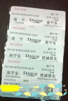 2.南宁东~防城港北,动车,43元/人,8:30;