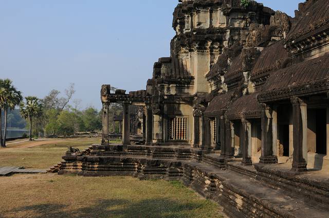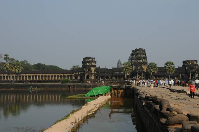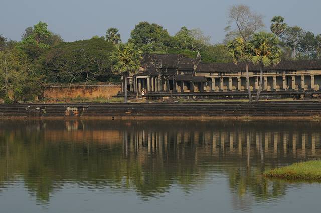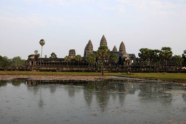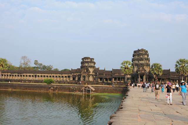 吴哥寺是古典高棉建筑的巅峰之作,它的比例良好、细节丰富,是全世界最大的宗教古迹。吴哥寺以广阔的护城河为外边界,形成一个东西宽1.5公里、南北长1.3公里的长方形,是吴哥地区最大的寺庙。吴哥寺的护城河宽190米,护城河的水很清,倒映着吴哥寺的倒影。过了护城河是吴哥寺的外围围墙,面积为1025*802平方米,由红壤砖建成。吴哥寺是一个朝西的建筑,在4座塔门中,西塔门规模最大。