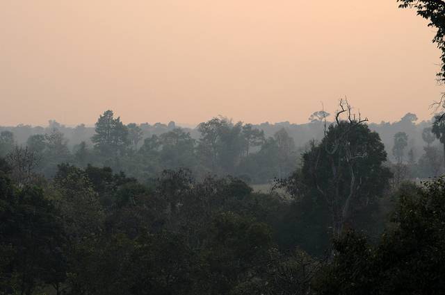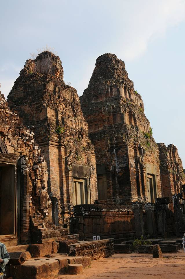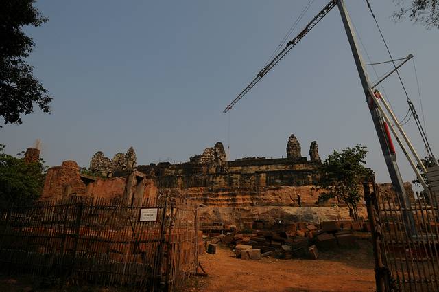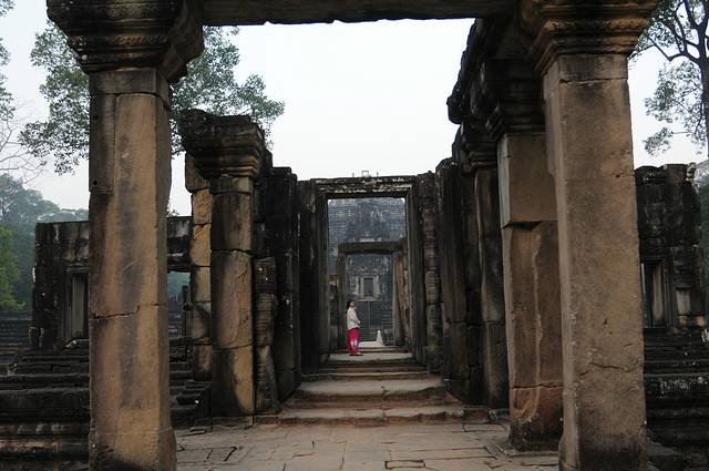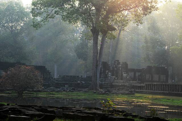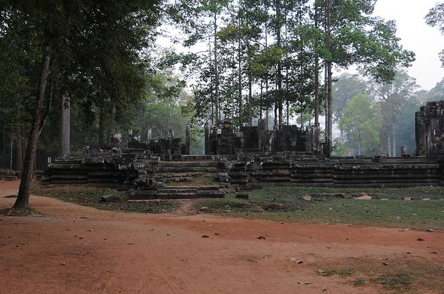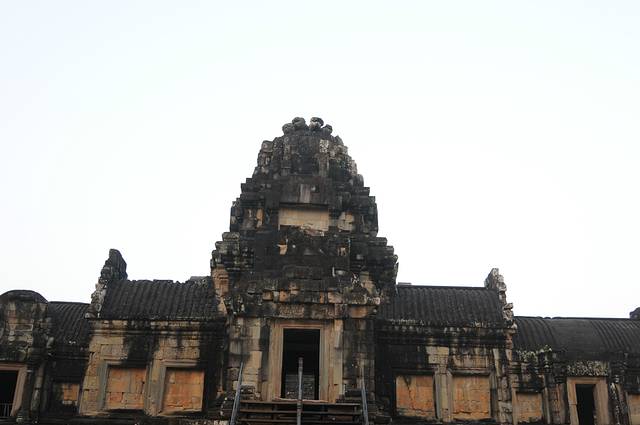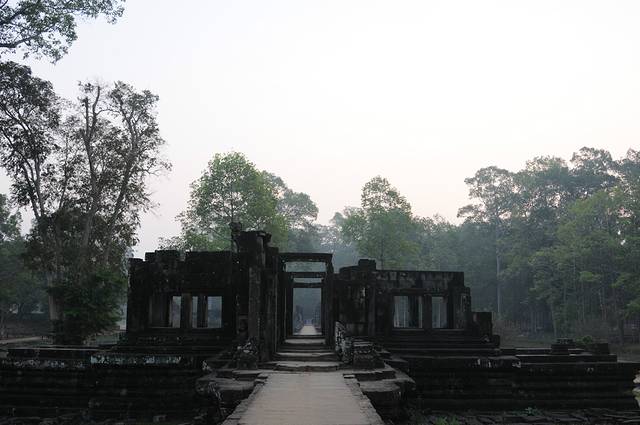 今天是我们在暹粒呆的最后一天了,还有两个景点没看呢!所以我们又起了个早,5:40起来,直奔大吴哥城的巴方寺参观。 6:30我们到了大吴哥城,没有了喧嚣的人群,清晨的大吴哥十分安静。早上雾气大,巴戎寺前面的广场有些朦胧。偶尔有当地人骑着自行车或是摩托车经过。或许,这就是吴哥城应有的本来面貌? 巴方寺也有译成巴本宫的,建于1060年,建造者也不太著名,是优陀耶迭多跋摩二世,这里是他的国庙。巴方寺规模不小,最外围的面积是425*125平方米,呈长方形。从斗象台北面穿过去就到了巴方寺的东塔门。前一段时间巴方寺在维修,现在已经修复完成,可以随便参观了。