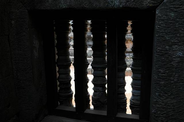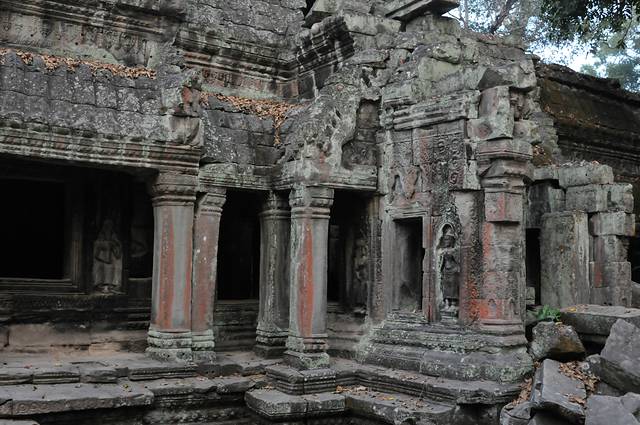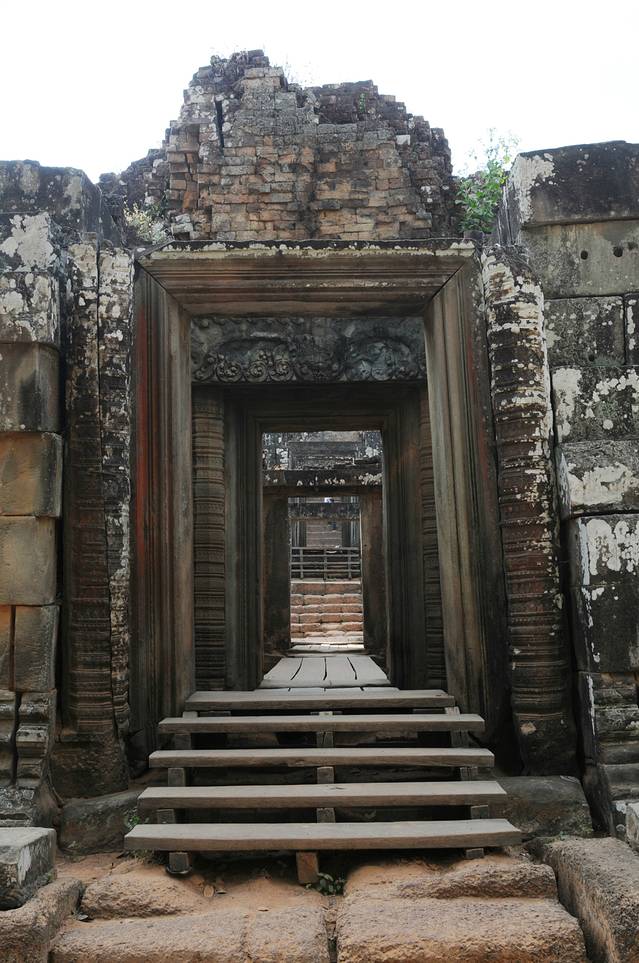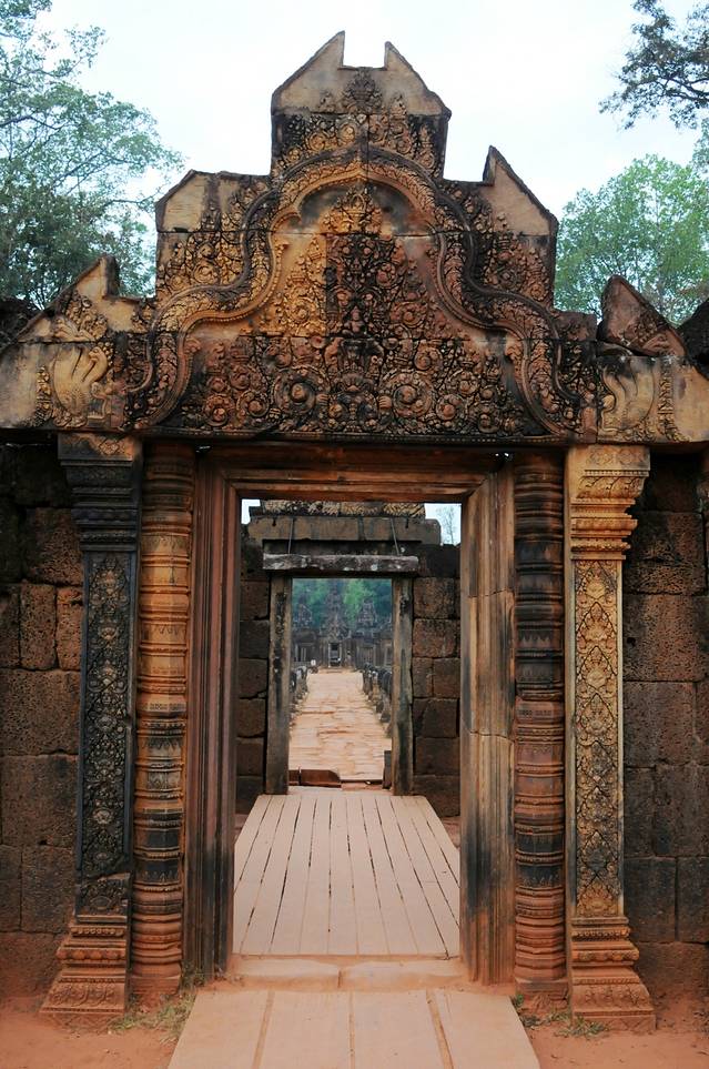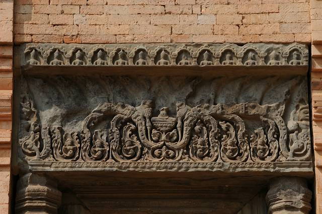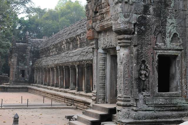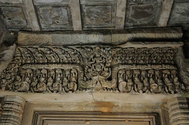 內围围墙和中央殿堂之间也有一个跳舞大厅,门楣上方有着连续纹样一样的阿帕撒拉仙女在跳舞,有二十个左右,比圣剑寺还要多。阿帕撒拉上方本来雕刻着佛像的,在婆罗门教复兴时被凿掉了。在塔布笼寺,随处也可见毁佛的痕迹。现在这里在维修,不能进入。早晨也没人管,我们进去拍了几张照片。