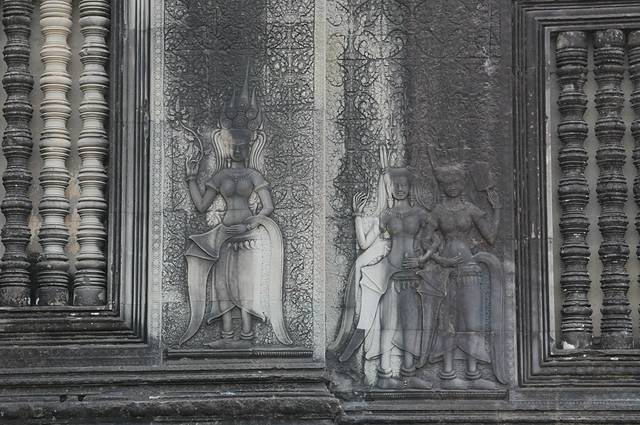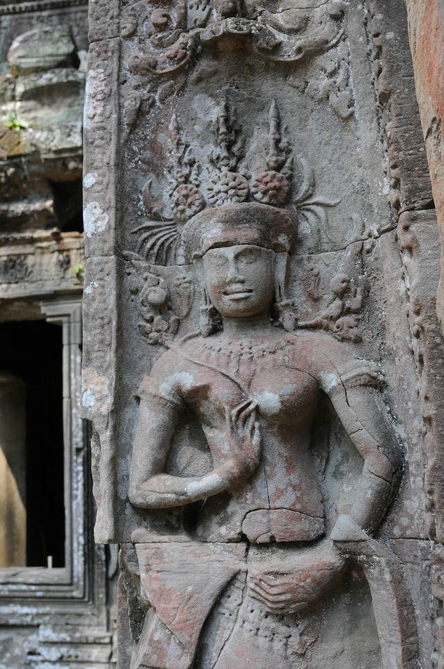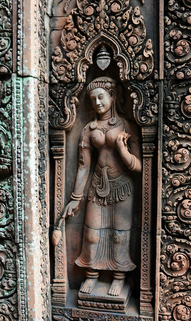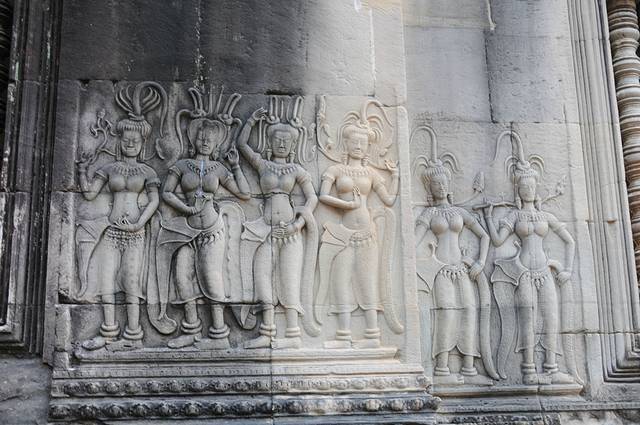 3、 阿帕撒拉像,尤其是有特色的几尊:西塔门正门的南侧几米有一尊露齿微笑的阿帕撒拉,西塔门内侧有一尊对镜梳妆的阿帕撒拉;在第一回廊北侧外墙壁,有两尊没穿纱裙的阿帕撒拉像,有一尊修复的完整一些;在第二回廊内侧东部墙壁,有一尊表情悲伤的阿帕撒拉;还有比较著名的四尊雕刻有华美发型的女神。在第二回廊北侧中央殿堂南侧的外墙上,有几座阿帕撒拉的初稿,雕刻还未完成,底稿的线条残缺不全。