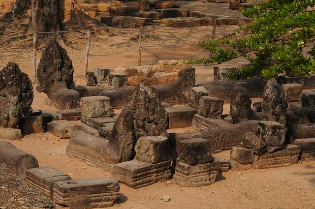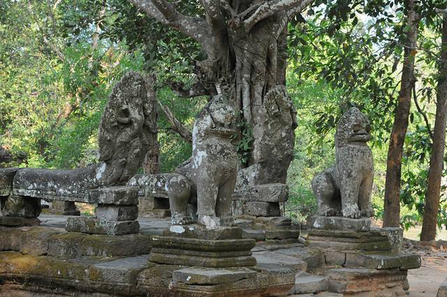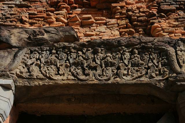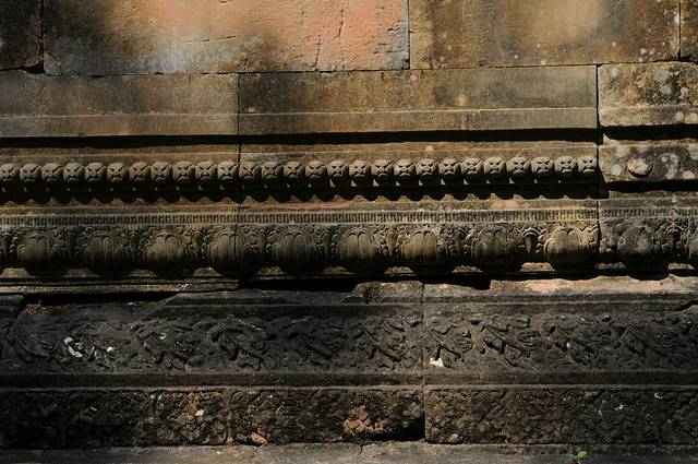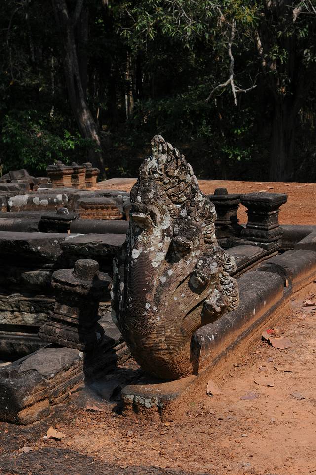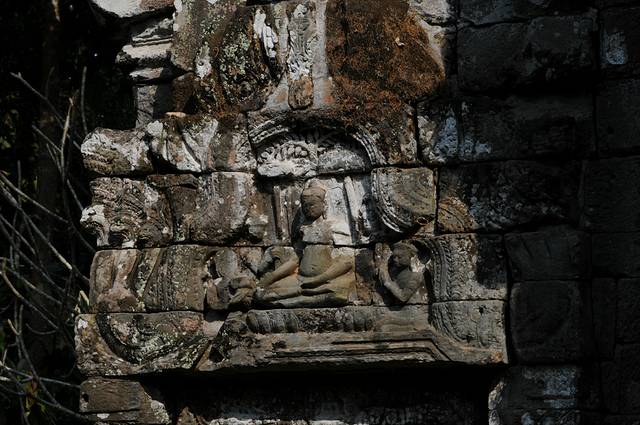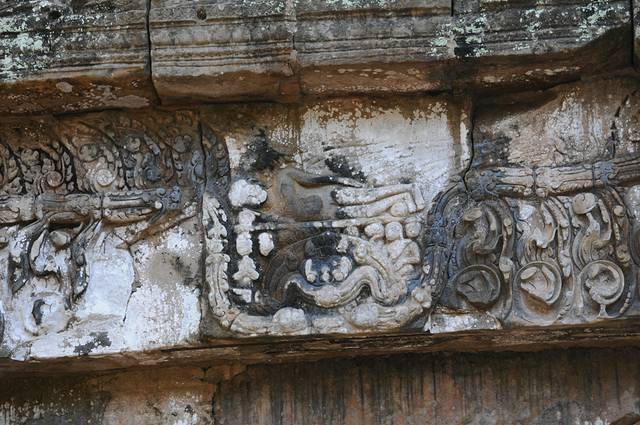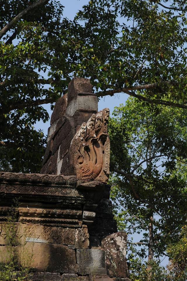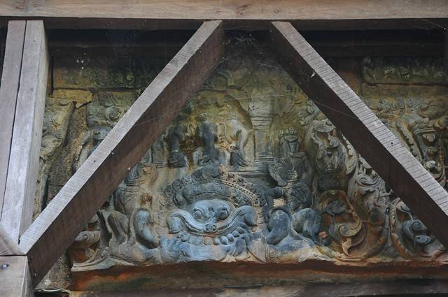 圣琶丽寺周围也是丛林环绕,保存状况也不太好。比较有特色的是:露台上有精雕细刻的七头那伽,寺院的山形墙上雕刻着佛陀的事迹。我注意到东塔门的山形墙上雕刻有佛祖的涅槃像,北侧的山形墙则是抚摸着大象的佛祖。