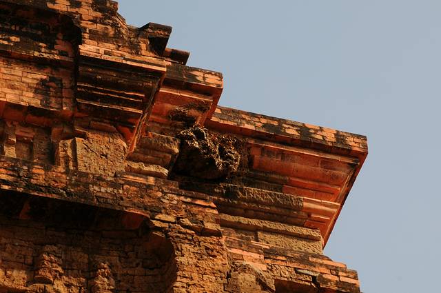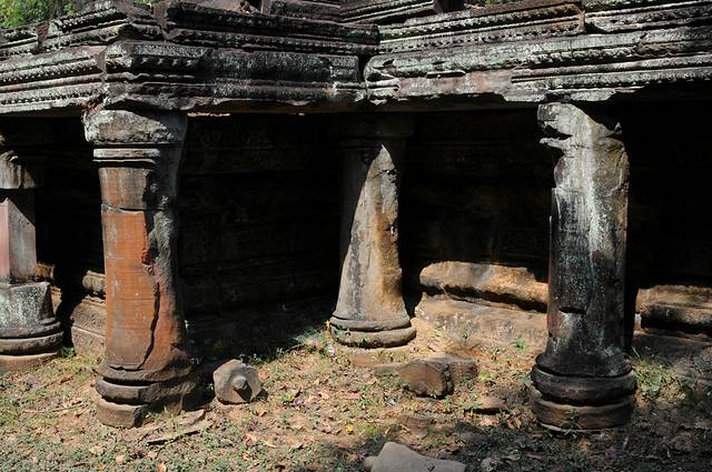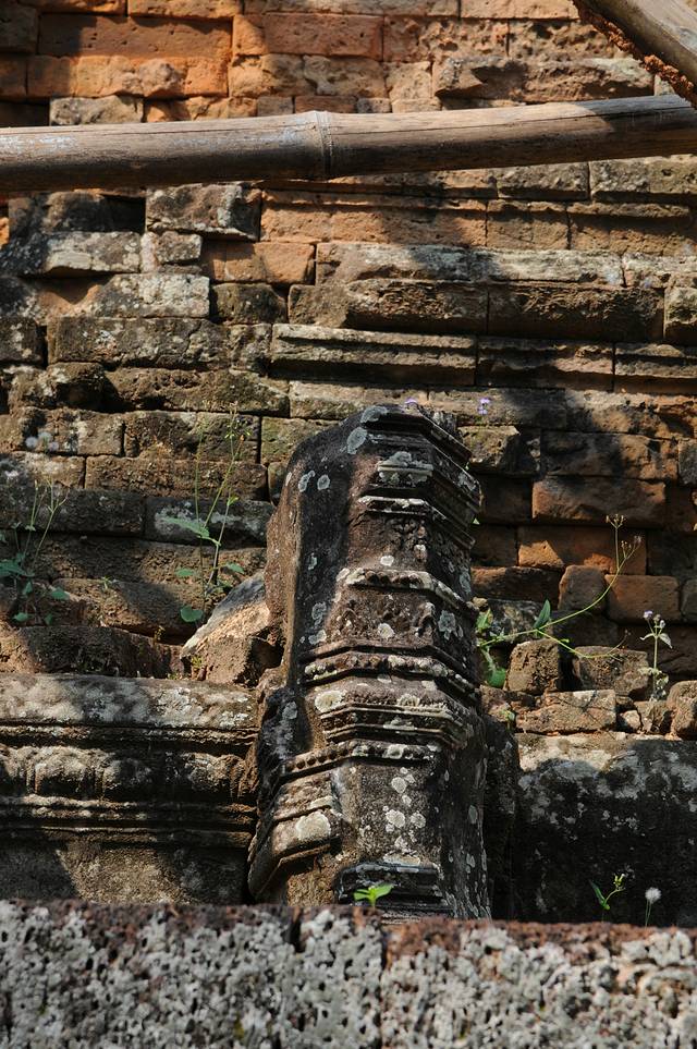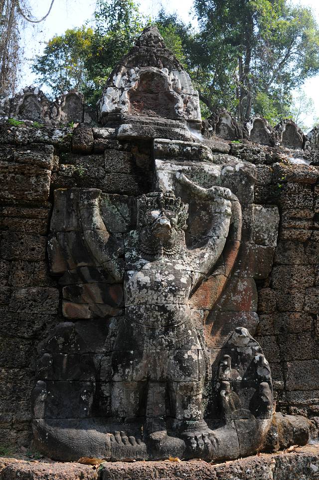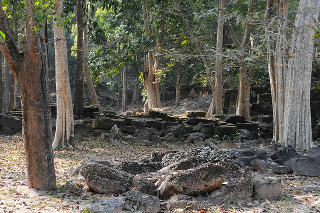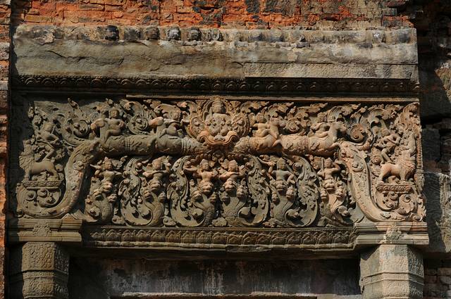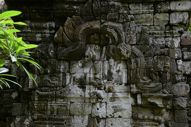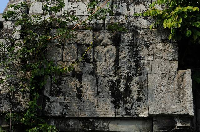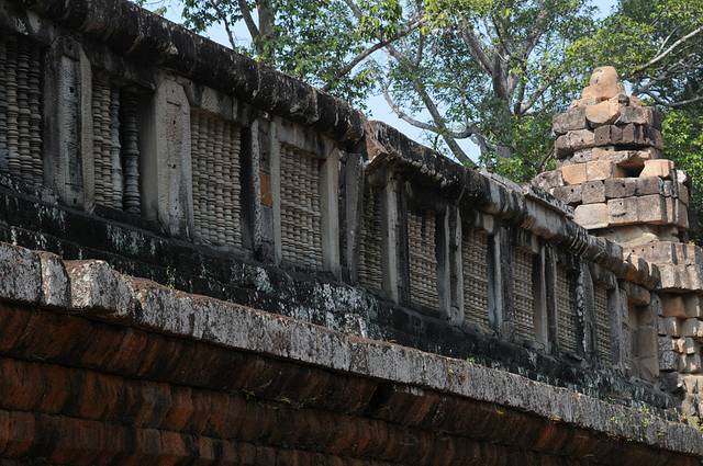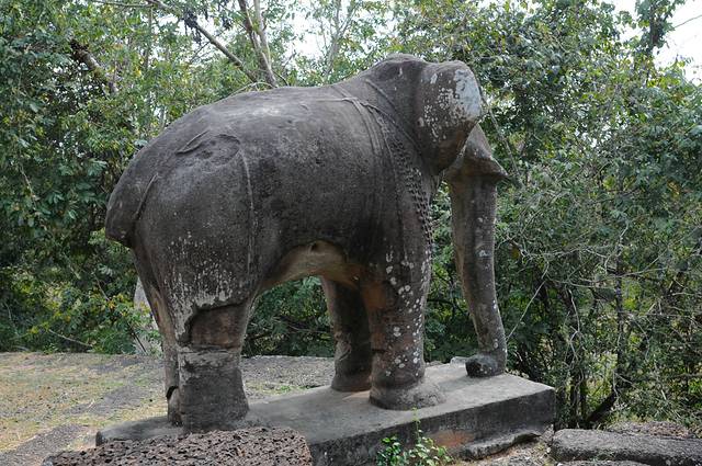 圣琶丽寺周围也是丛林环绕,保存状况也不太好。比较有特色的是:露台上有精雕细刻的七头那伽,寺院的山形墙上雕刻着佛陀的事迹。我注意到东塔门的山形墙上雕刻有佛祖的涅槃像,北侧的山形墙则是抚摸着大象的佛祖。