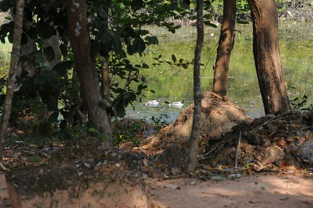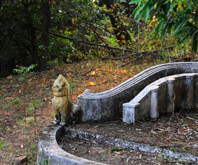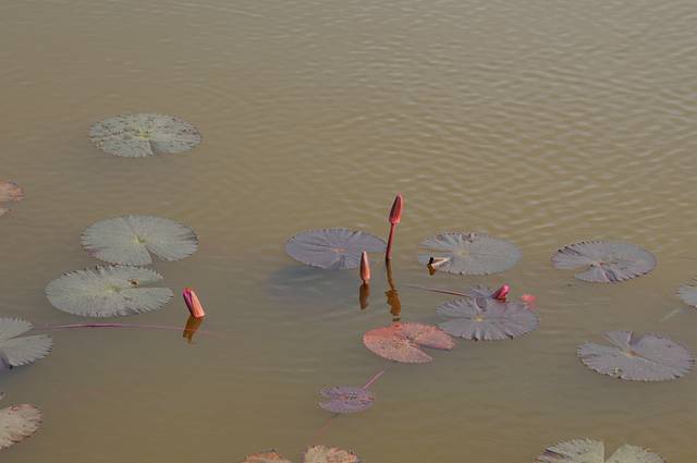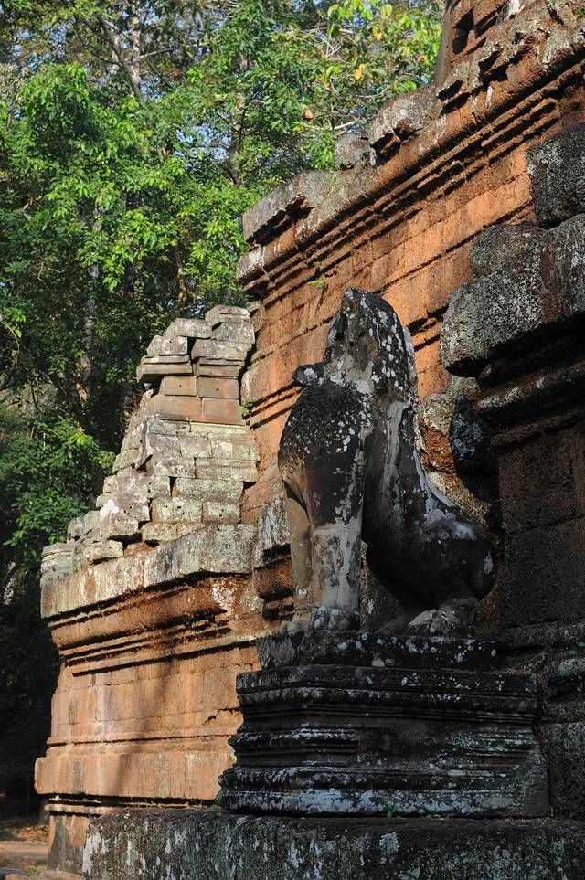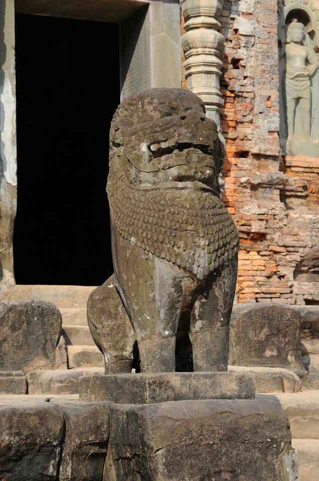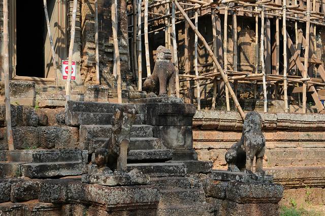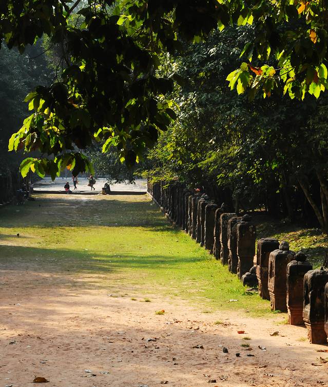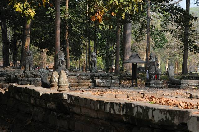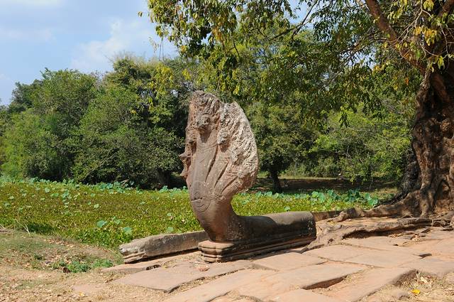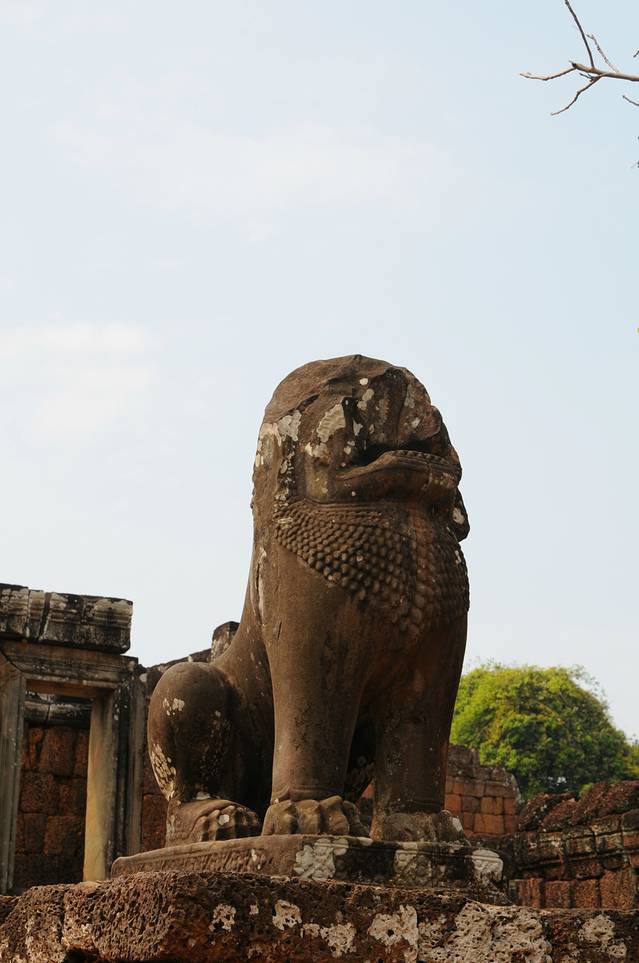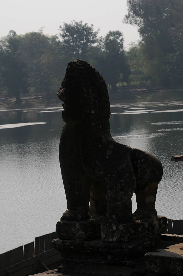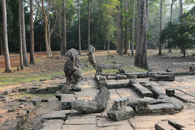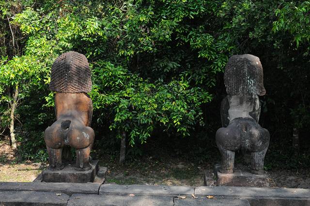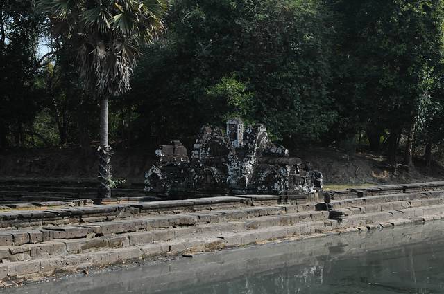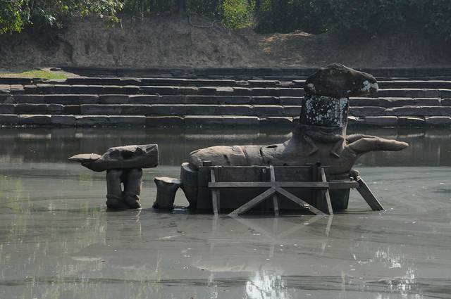 皇家浴池东西长约700米,南北长约350米,班黛喀蒂寺正对面就是它的上岸码头。码头上通往湖水的台阶有两只石狮守护着,周围散落着一些石制的建筑构件。码头现在正在维修,也下不到湖边。我们在这里略微看了看,没花很长时间。