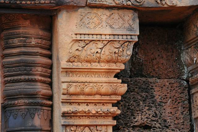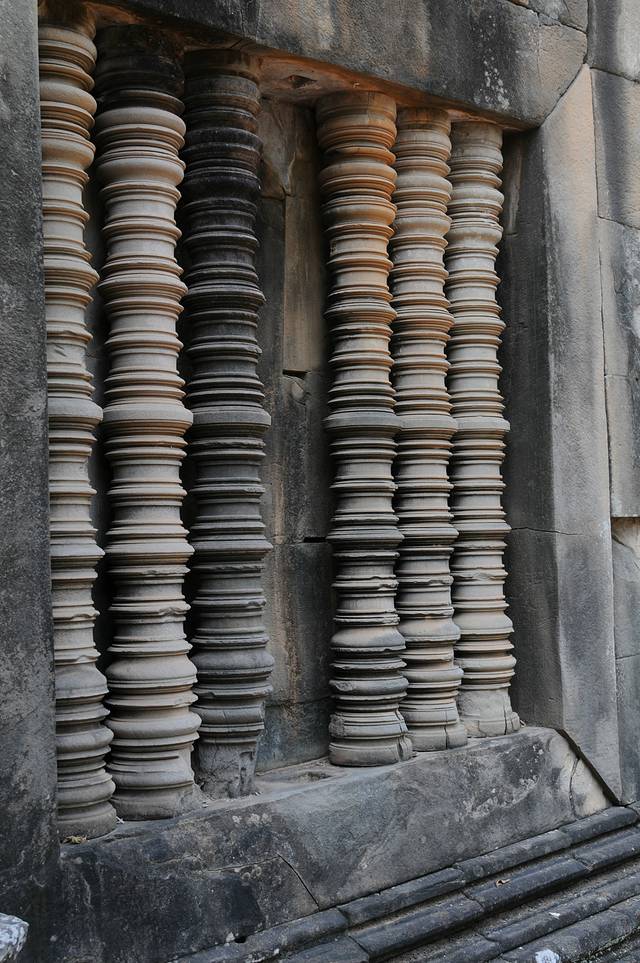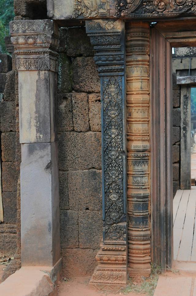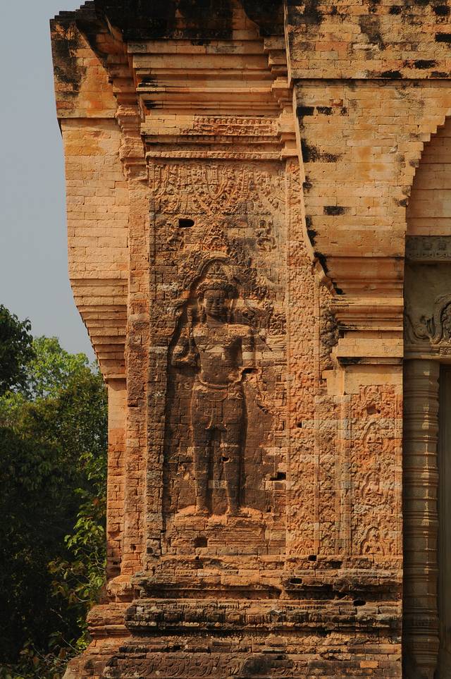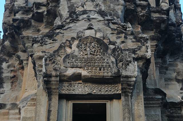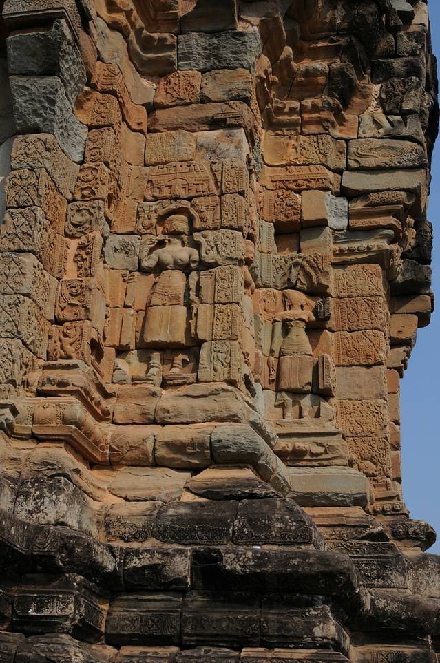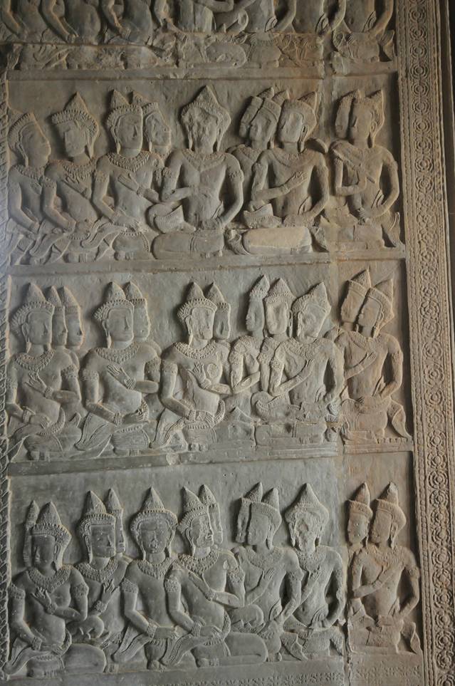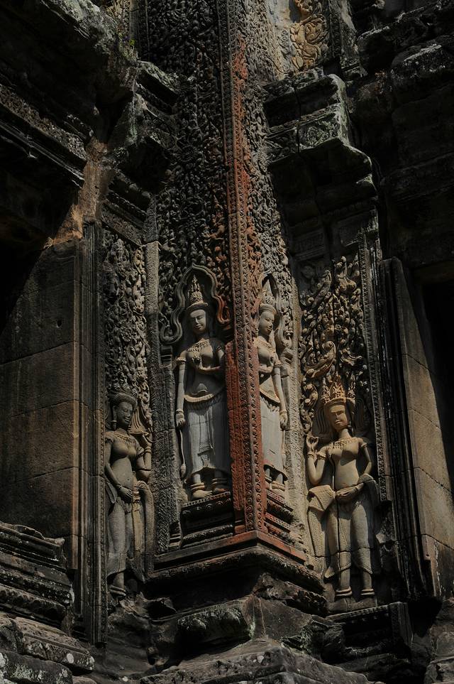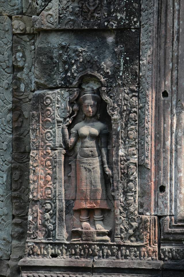 第三层的阿帕撒拉像也很多,雕刻风格和下面的相同。同下方的阿帕撒拉像一样,很多雕像的胸部都被游客摸得发亮。三层的门楣、山形墙都有雕刻,廊柱上的浅浮雕也很细致。我们对印度教不熟悉,也不知道都是什么场景,就看个热闹吧。