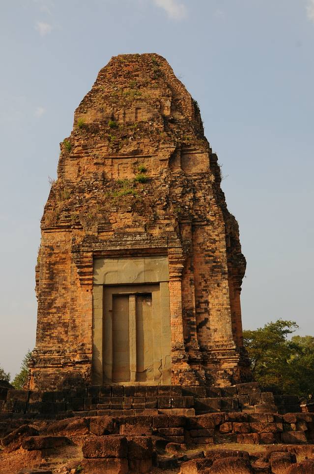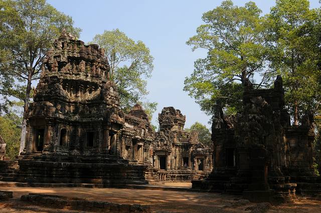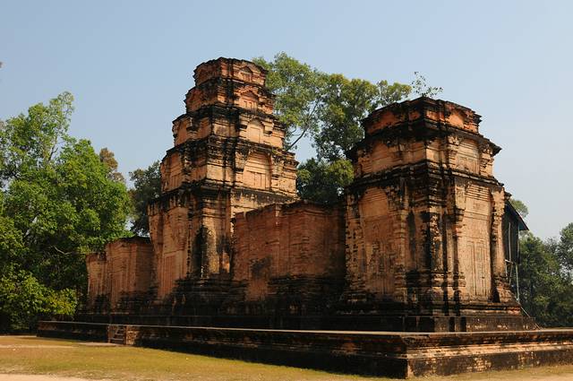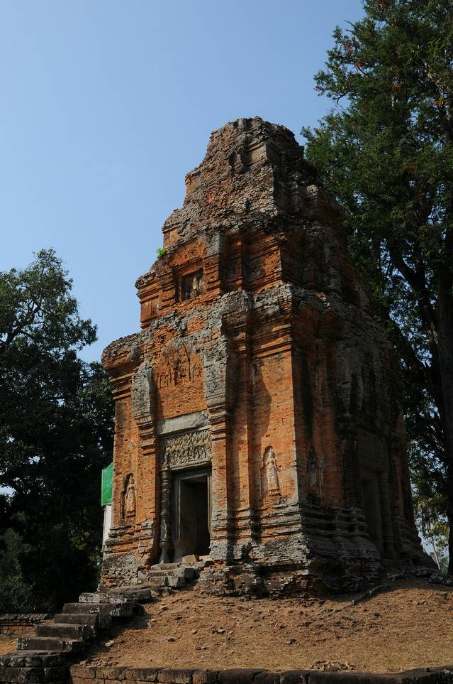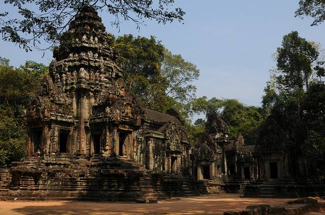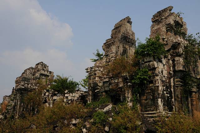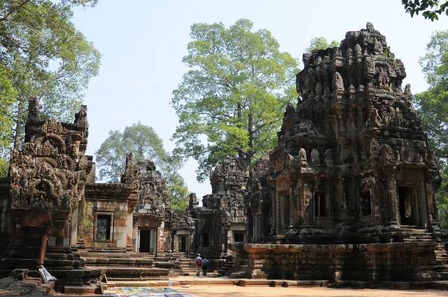 4、 豆蔻寺是唯一一个五塔连成一线的寺院,中央塔和南塔的砖雕也非常精美,值得细细参观。顺便找找带CA字样的砖。 5、 茶胶寺规模不小但雕刻很少,参观不会花很长时间。站在高耸的中央塔内,四处一望有种很广阔的感觉。注意短型长廊在吴哥古迹中是首次出现。