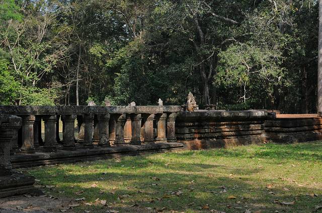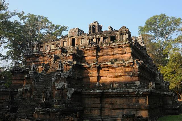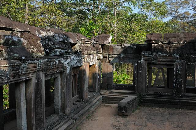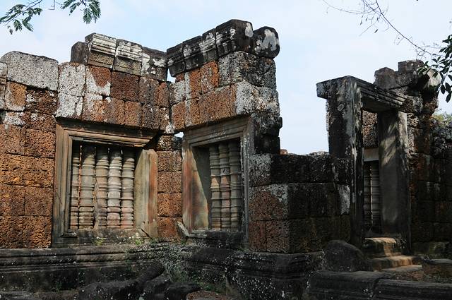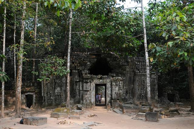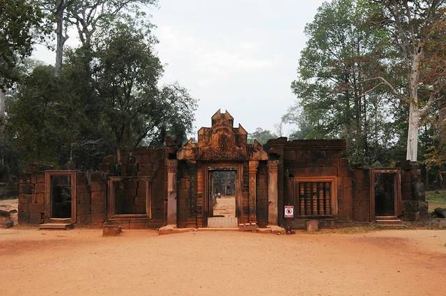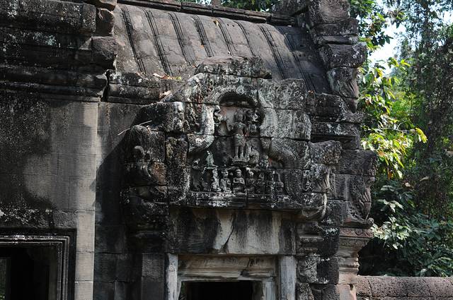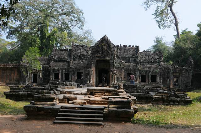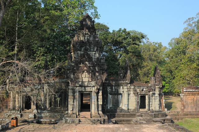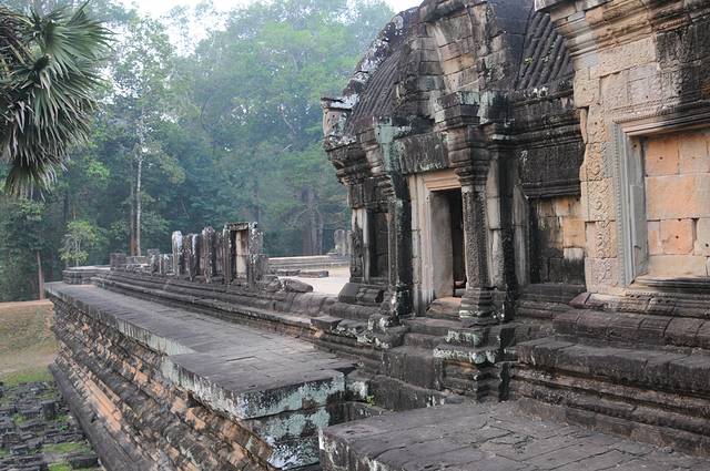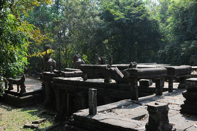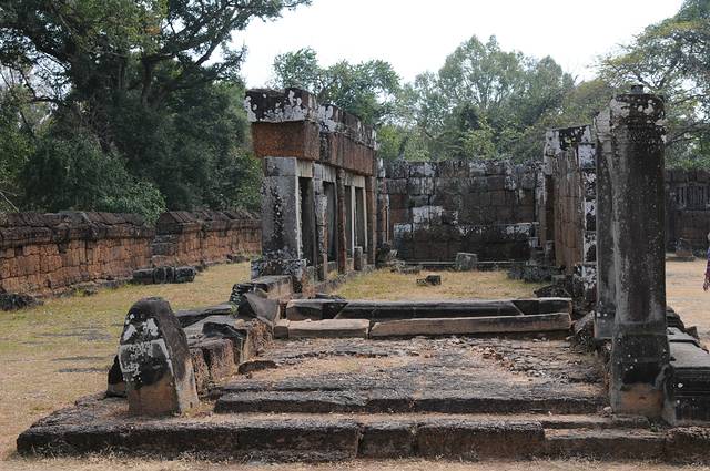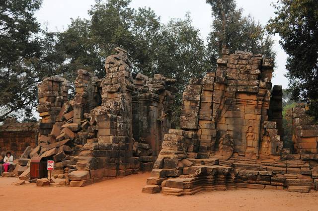 1、 东门内不远,有一座2层楼石造建筑物。这是一座有希腊神殿风格的建筑物,在整个吴哥古迹中是独一无二的。