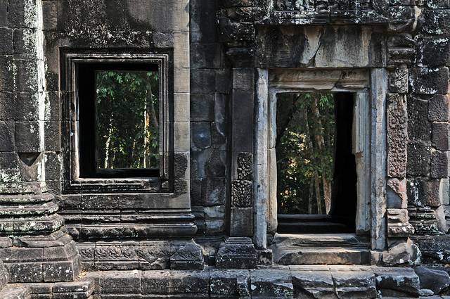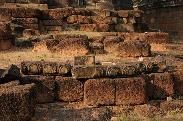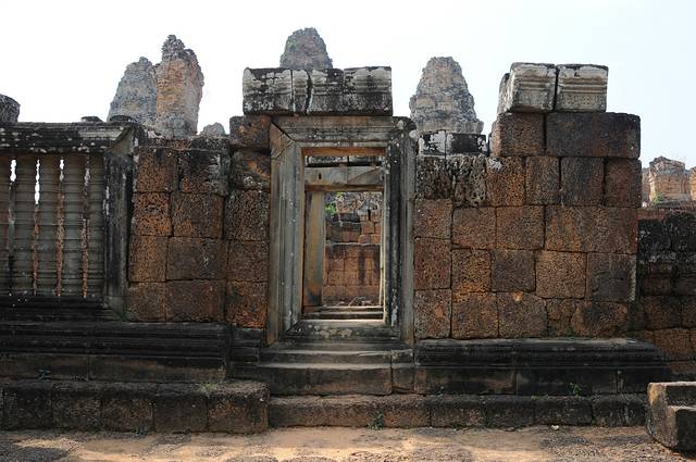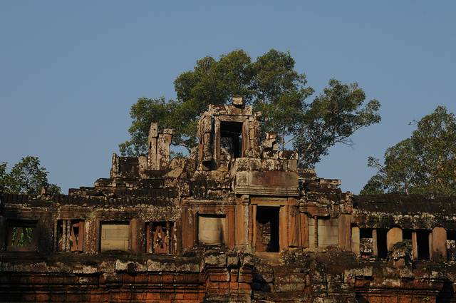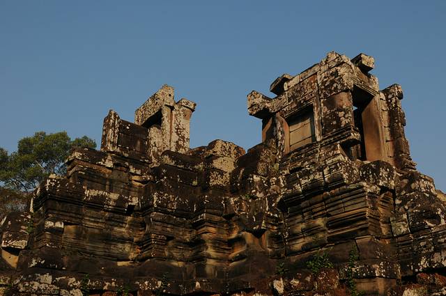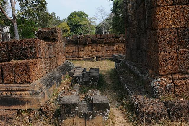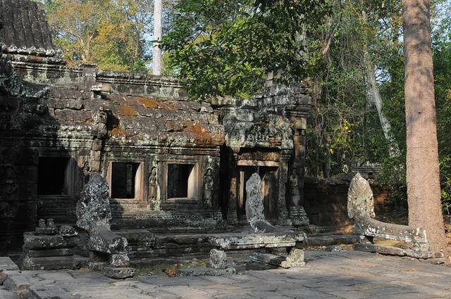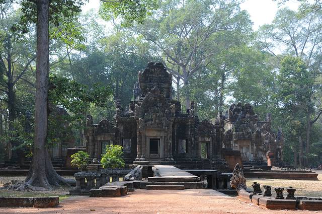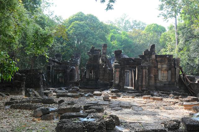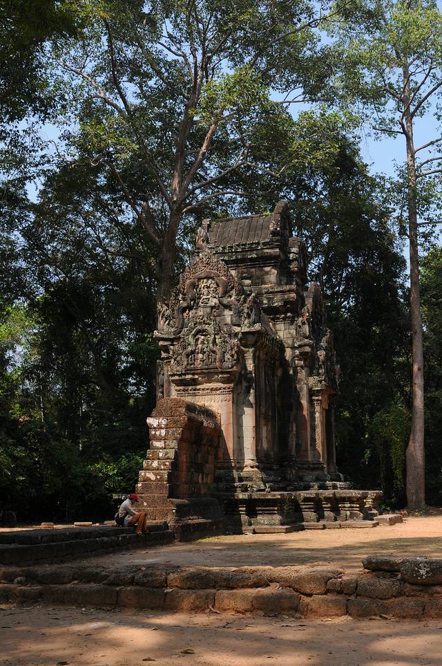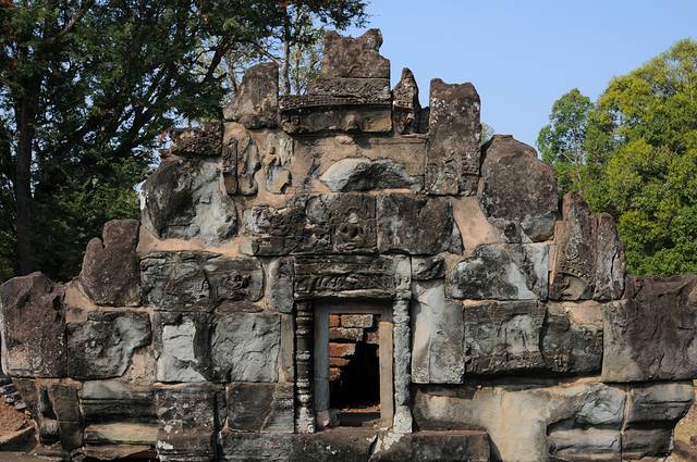 1、 东门内不远,有一座2层楼石造建筑物。这是一座有希腊神殿风格的建筑物,在整个吴哥古迹中是独一无二的。