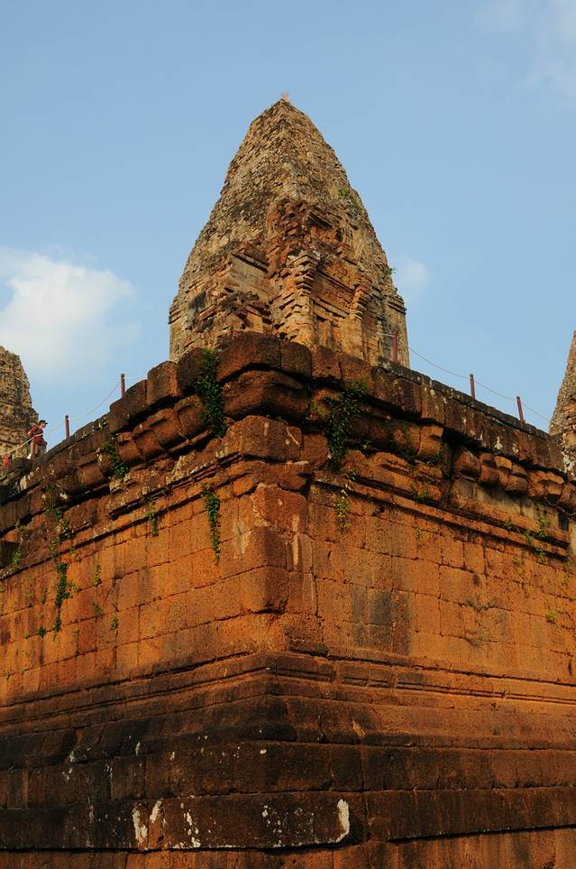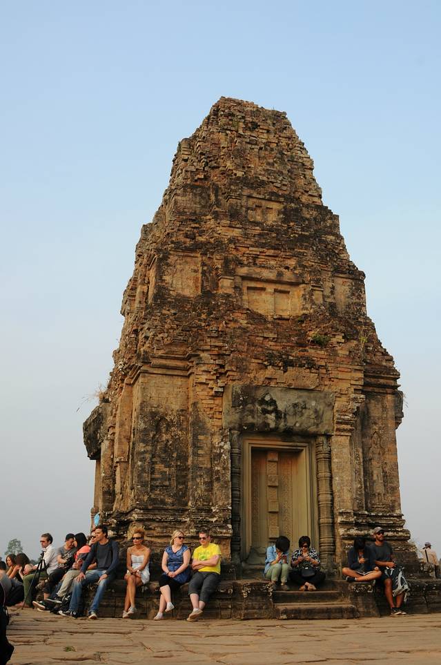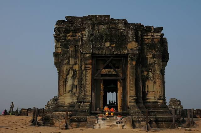 我们从西侧的阶梯上到塔顶,阶梯比较陡,爬起来要小心些。塔顶的建筑比较简单,有一个小的殿堂,四周有连续的砂岩长廊。殿堂内有一个神像,有人负责照看。当年周达观到这里出使,得知国王每夜都独自一人到塔顶呆一段时间。他想方设法打听到,高棉国王在古皇宫的圣殿内,每晚和九头蛇精同寝交欢。九头蛇精化为女身,交欢后她会告诉国王如何治理国家。并且把这些传说记载到了《真腊风土记》中。也不知道是提供给他消息的人没说清楚,还是周达观理解有误。实际上,这是一个国王静坐的地方,蛇神就是那伽,是高棉人的保护神。