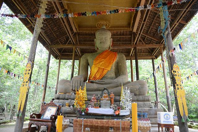 圣琶丽寺往东大约200米的样子,路北有一个寺院,叫泰普拉南(也有译成提琶南的),我们经过时看到当地人好像在里面做法事。路南的楼阁里里供奉着一尊大佛,背后的小开间内还有一尊立佛。不知道哪尊大佛是原来巴戎寺的主佛像。这尊佛像在13世纪中叶闍耶跋摩八世灭佛期间遭到破坏,直到1933年才被找到。从1935年起,这尊佛像被迁移到这里供奉。