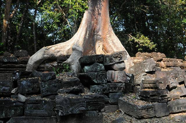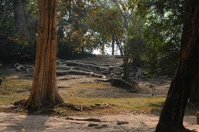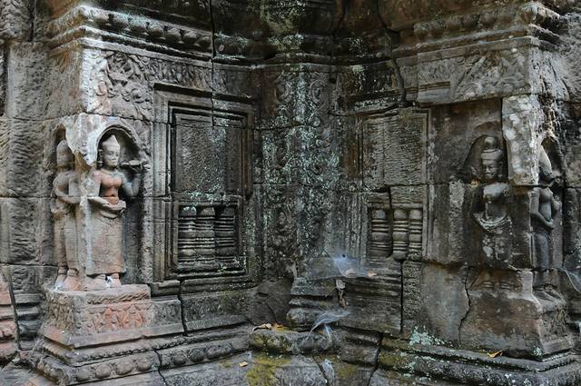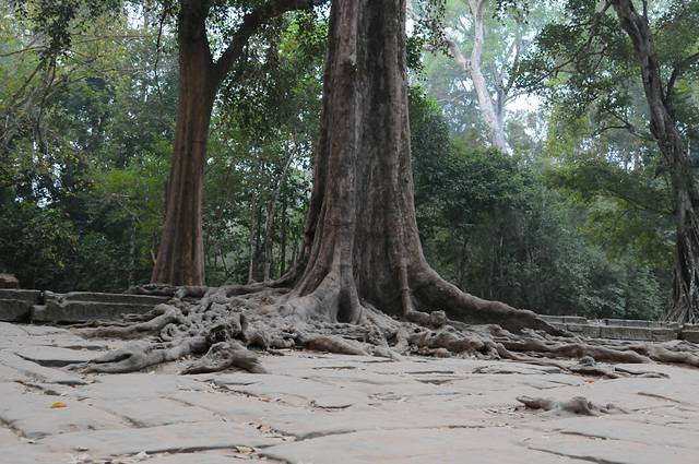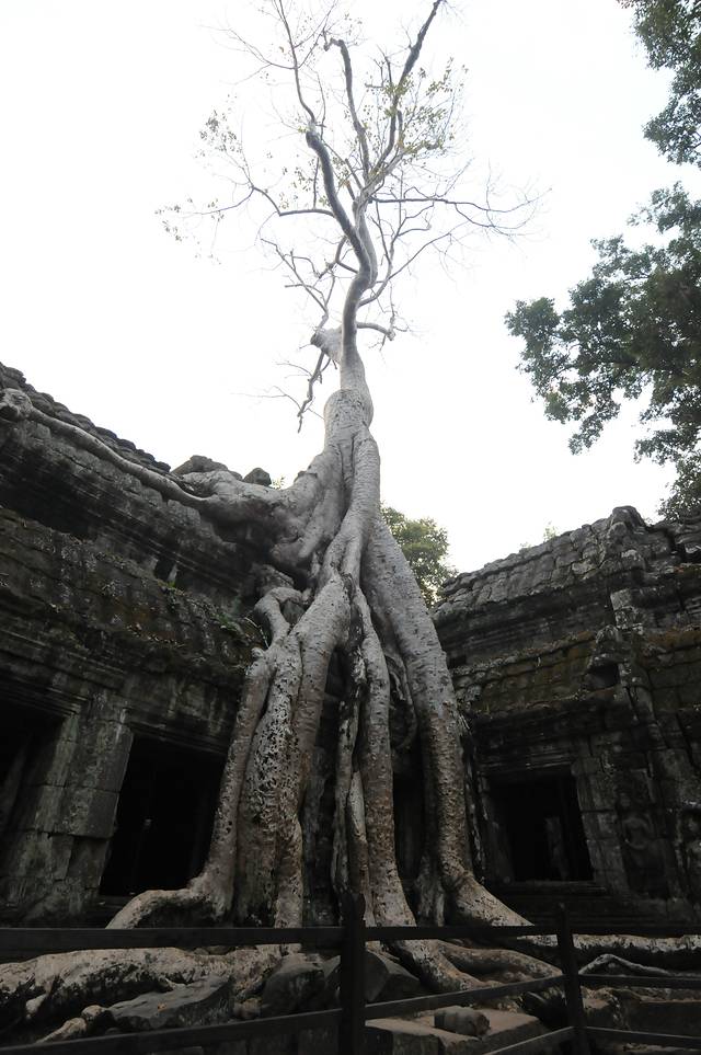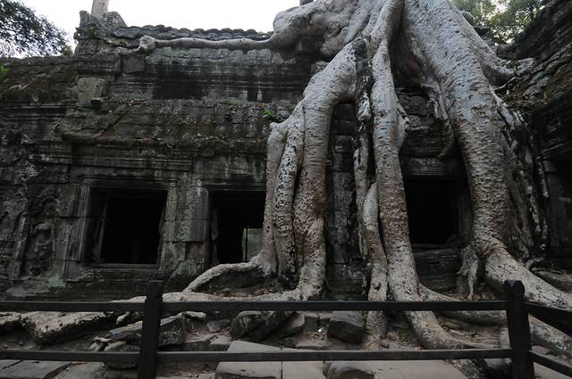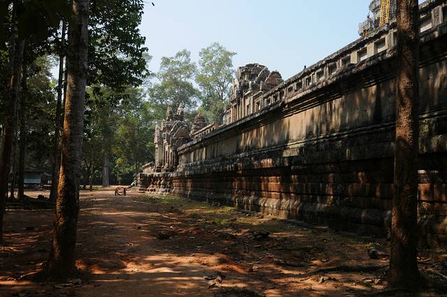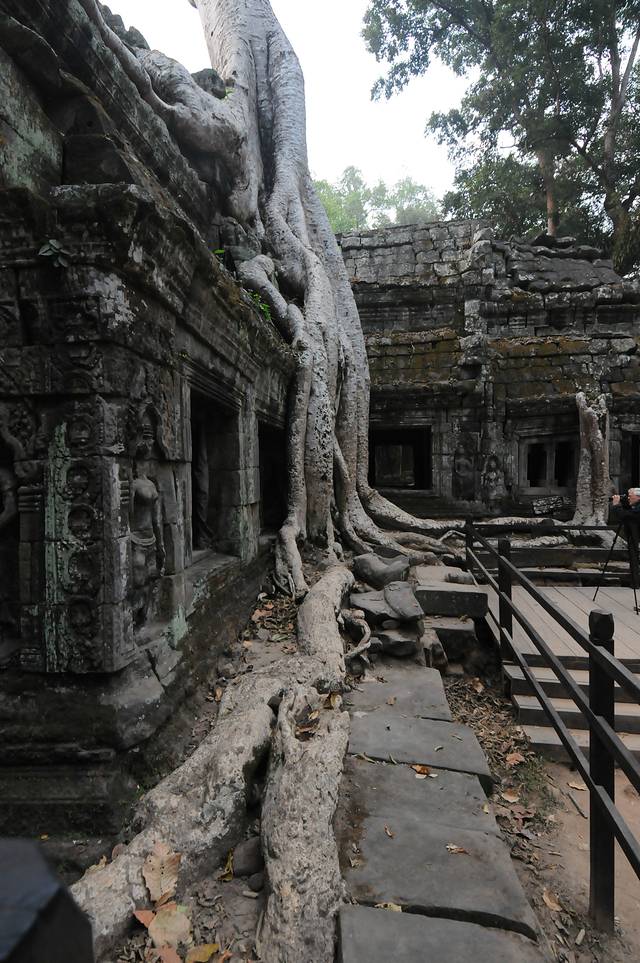 中央殿堂的风格和圣剑寺很像,墙壁上雕刻着很多漂亮的阿帕撒拉。在中央殿堂外侧环绕着环形长廊,长廊的南侧有一棵大树,应当是木棉吧,树根环绕着长廊,几乎把长廊压垮。绕到长廊的另一侧,树根垂落到地上,也很漂亮。这棵树的北边不远,穿过长廊,就是在照片上常常见到的那棵巨大的绞杀榕,树根盘根错节,像网一样包绕着石头长廊和角楼。