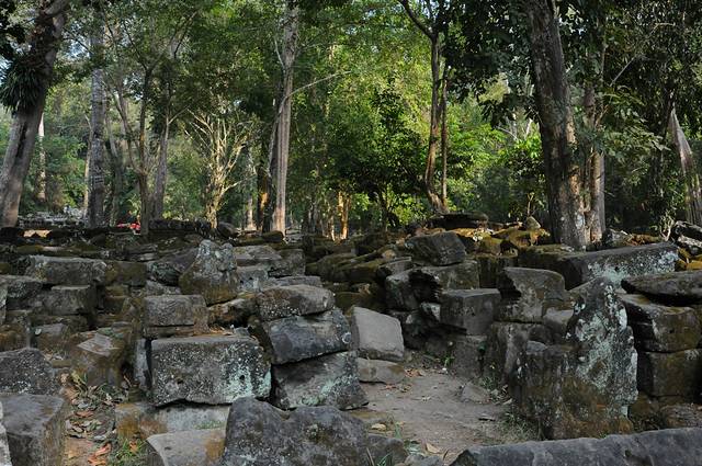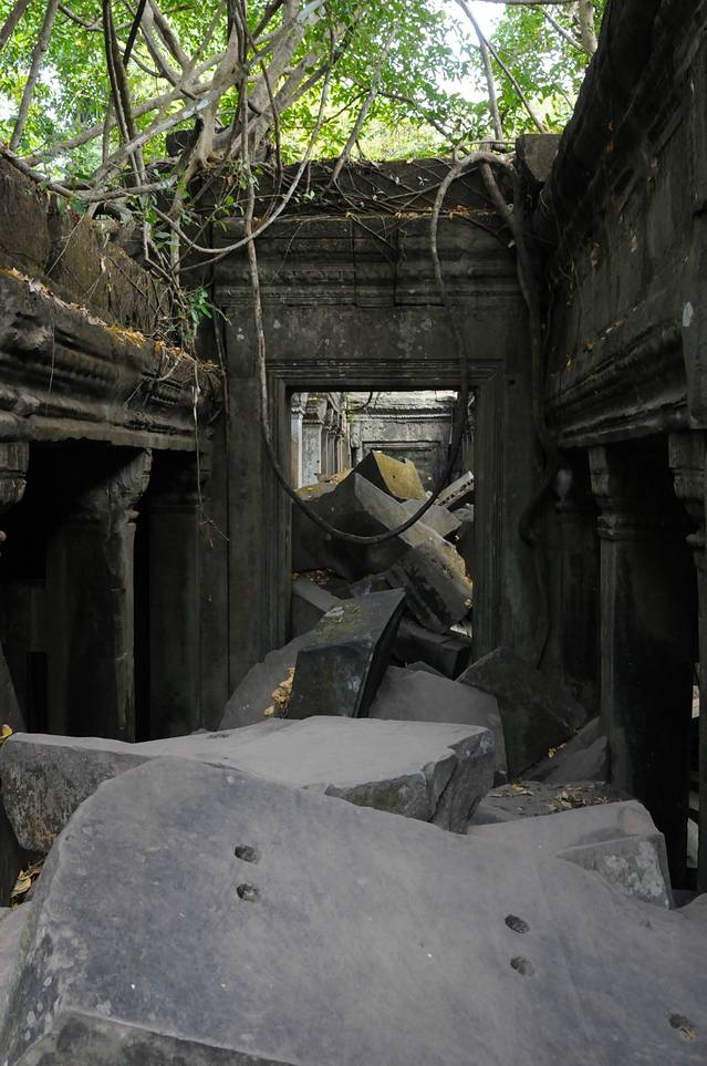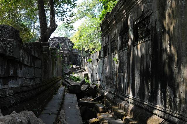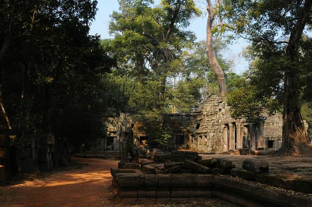 塔布笼寺参观起来就显得有些乱了。总的来说,塔布笼寺也是由三重围墙包绕。外围东西长1000米,南北宽700米,中围和內围之间,西侧距离很近,有一个跳舞大厅;东侧距离宽一些,有一座正在维修的殿堂,两个圣池,还有一些卫星寺庙。內围的中央是中央圣殿,东南角有一栋藏经楼。 我们是从西侧进入的塔布笼寺。西塔门很不完整,只剩下了两堵墙。进入以后是一段长长的林荫道,早上人少,十分安静。塔布笼寺的特点就是在寺庙的修复过程中,不砍伐树木,绞杀榕和木棉树在废墟间生长。一般来说,较高大的是木棉树,主要特征是粗大、淡褐色、多疖的树根,稍小一些的是绞杀榕,树根呈灰色、较细、较光滑,四处纠结缠绕。实际上我们也分的不是太清楚。这两种树木通常都是由鸟类将种子散播在建筑上的缝隙内,接着开始生长,树根穿过石块间隙向下伸入土里,随着树木越长越粗,逐渐将石块挤开,最后取而代之成为建物的支柱。在巨大的树木挤压下,寺庙勉强维持其结构。但是如果树木枯死或被暴风雨吹倒,建筑物就会失去倚靠而崩落。在这里能非常深的体会到大自然的威力,这也使得塔布笼寺内充满了神秘的气氛。