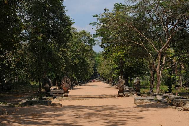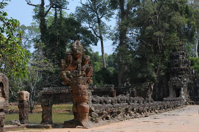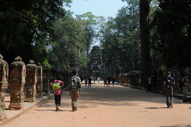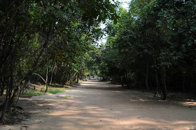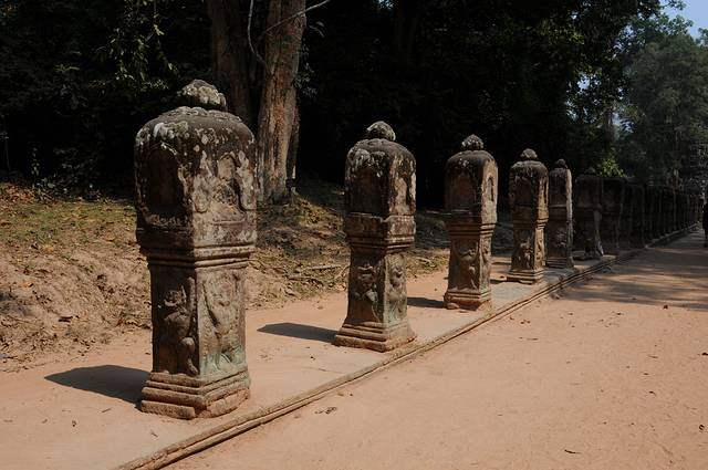 6、 圣剑寺中午人不太多,参观时也不很热。如果包车的话最好是东门进西门出,或是反着来,节省体力。圣剑寺东门附近的跳舞大厅,石柱式建筑物要多加注意。尤其是石柱式建筑物,在整个吴哥古迹中是独一无二的。东塔门和西塔门两侧的迦鲁达雕像,可能是吴哥古迹中最大的了。另外,圣剑寺灭佛的痕迹比较重,也值得注意。