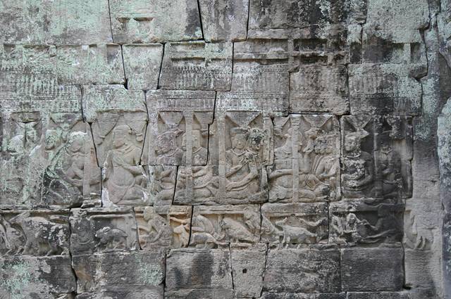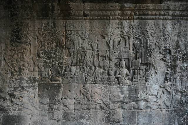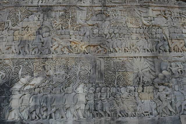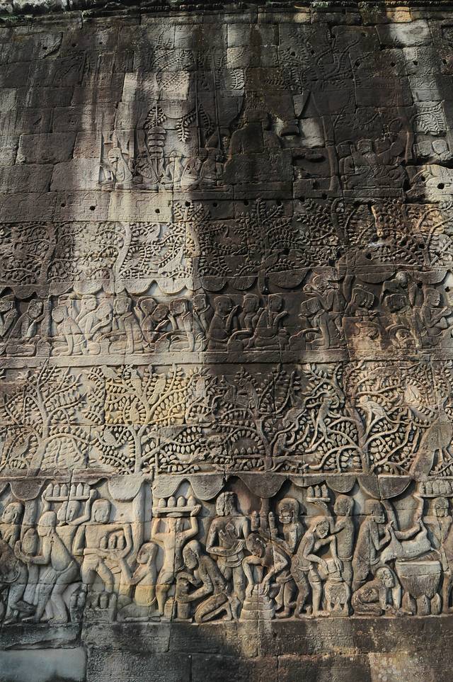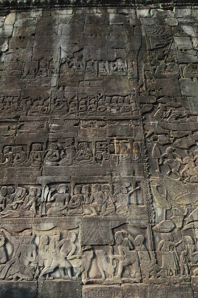 7、 龙蟠水池封闭了进不去,但是附近的大湖倒是挺漂亮,顺路参观即可。 8、 格劳尔哥寺是一个很小的寺院,顺路看看就行。 9、 胜利之门名字挺好听,游客不多比较安静,保存的一般。 10、 巴戎寺的高棉的微笑是一个非常震撼的地方,我觉得在日出日落时分欣赏最为合适。相对而言,早上8:30以前和日落时会清静一些。 11、 巴戎寺的壁画是另一个看点:外浅浮雕的南廊东翼和东廊南翼的壁画保存的最为完好。欣赏时除了注意战争场面外,还要注意最下层反映老百姓生活的场面,这是是表现柬埔寨民间生活的唯一史料。东廊南翼的军队中,有一段据考证是南宋的军队,士兵扎顶髻,参观时一眼就能看出来。