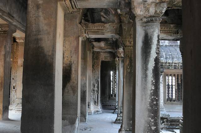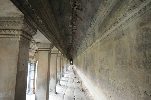 吴哥寺第三层的长廊共60米,四座塔楼分据各角落,并以数条轴向长廊连接42米高的中央神龛塔楼,整体上有一种类似十字形回廊的感觉。回廊内有一些佛像,中央神龛的四个门厅内也供奉着四尊立佛。