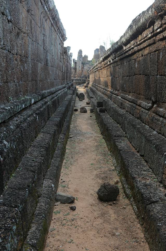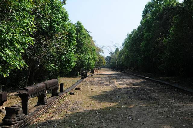 经过东塔门以后,首先看到的就是一个长长的空中参道。这段参道长200米,说是空中参道,实际上是一段架高的石板路,由4列高约两米的粗大石柱支撑。这段参道有连接地上和天界的“彩虹之桥”的含义。参道的左侧有一个水池,水不深,我们到的时候有工作人员在清理,水深也就到他的腰部。参道的中央靠近中心建筑一些,有一个十字形平台,上面有一个没有顶的石柱建筑遗迹,可能是以前的外塔门。十字平台的左侧有一个很规整的水池,是以前的沐浴场。