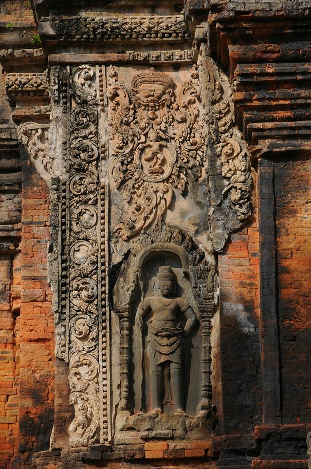 豆蔻寺砖塔的建造水平高超,建造时没有使用砂浆,而是以植物混合物代替,因此极窄的砖块叠层极为精准。中央圣殿壁龛内护立两旁的达托帕拉门神,是用雕入砖块内的方式刻成。修缮期间加入的一些新砖块,特别以吴哥保护中心的英文缩写“CA”标示。