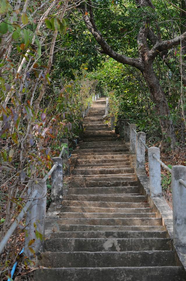 最早的时候,东西南北四个方向都有石质台阶能到第三层,都比较陡。南侧中间有一段石质阶梯,旁边有金属的扶手。这里也称“爱情阶梯”,有扶手。据说有一年,一位法国男子和妻子同游吴哥寺,在走这段阶梯的时候,他妻子失足摔下去,不幸身亡。在悲痛之余,那位法国男子捐建了这一木质阶梯。