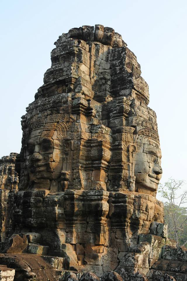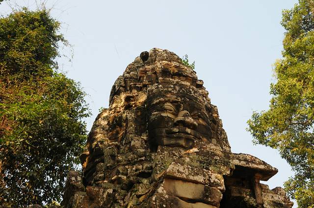 南门修整的最好,注意人面的塔楼的底部塔门雕刻:一只三头象用长鼻摘食莲花,形成支柱。