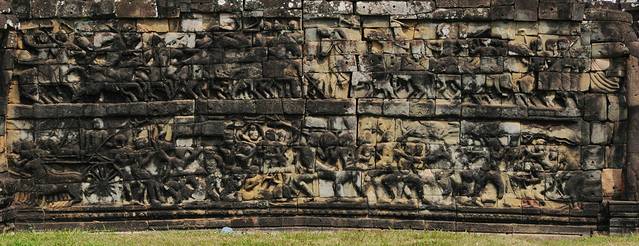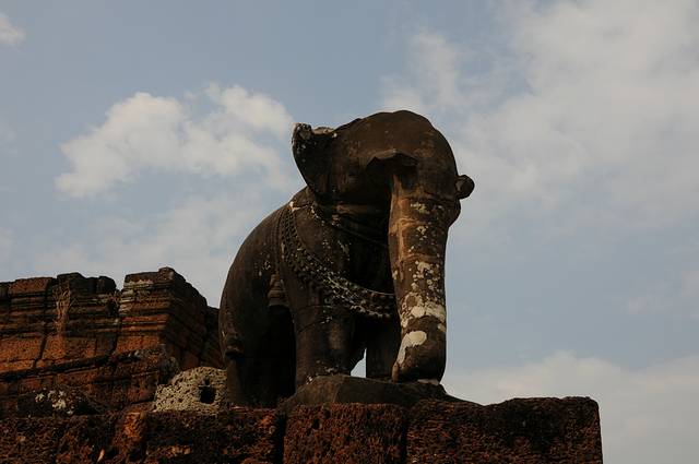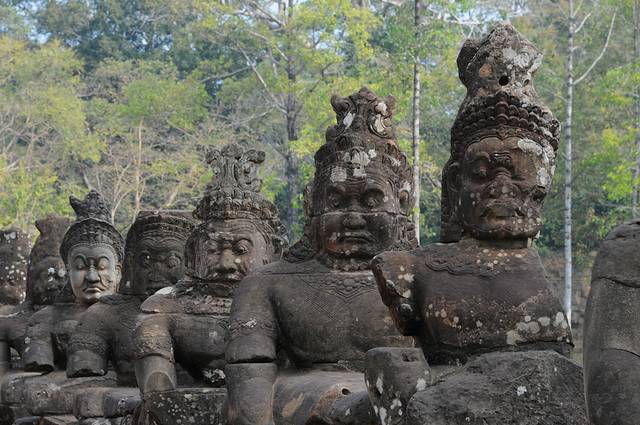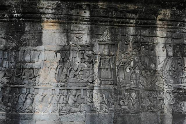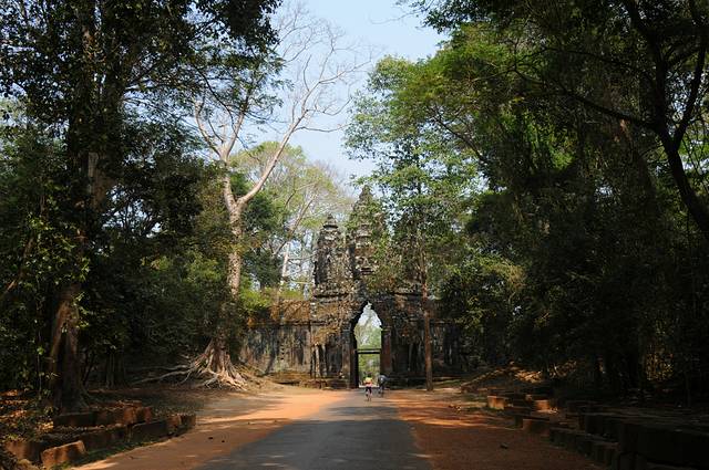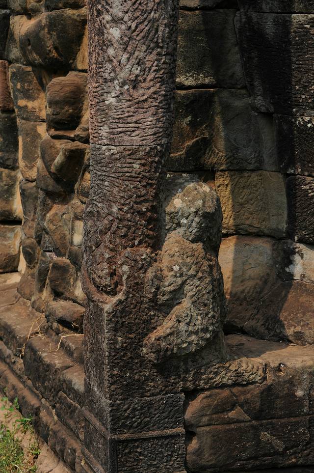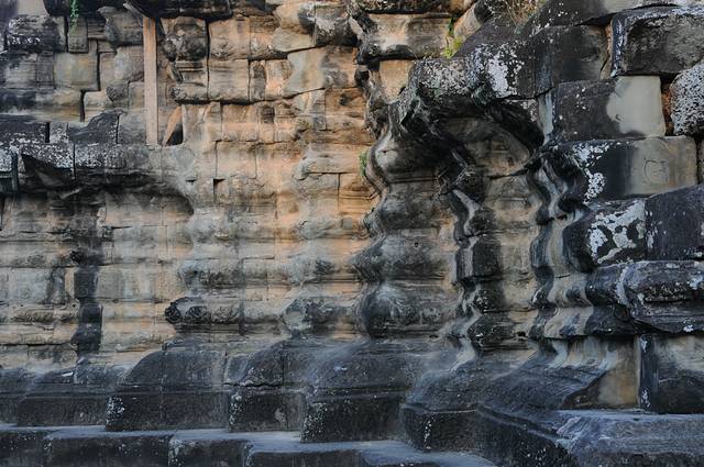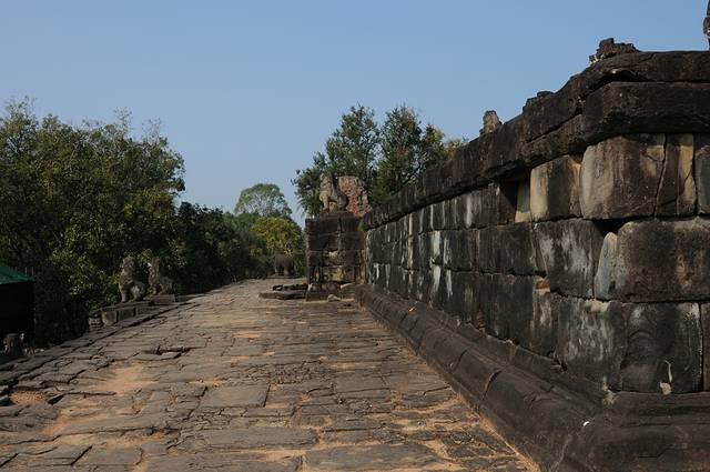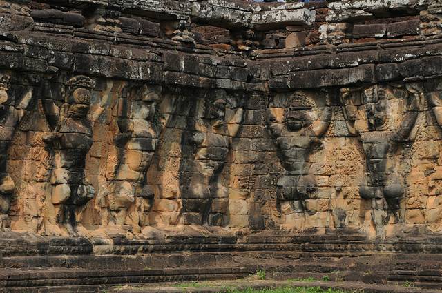 3、 大吴哥南门是几座城门中,修复最好的一座,可以仔细欣赏一下,这里护城河的水多一些,注意城门上大象的雕刻。 4、 参观斗象台和癞王台,主要是看基座的雕刻。斗象台中央平台上的象鼻雕刻,癞王台隐蔽通道的九头那伽不可错过。也可以在主平台上看看风景,想象一下当年吴哥王朝盛大的气派。