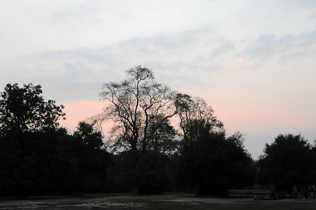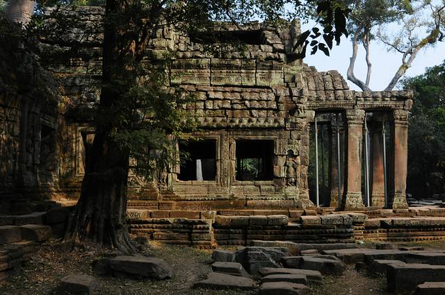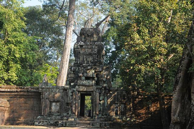清晨的塔布笼寺还是比较清静的,来来回回也没几个游客,可以安安静静的参观,也没有排队等照相的问题,想怎么照相就怎么照相。只是太阳照到这里也晚,没有光线景色显得有些平淡。 塔布笼寺也是由印度负责修复的寺庙,印度学者认为,树木已经在这里生长了500年,不应该把它砍掉,应当维持树木和古迹的共生状态。实际上这种修复方式更加困难,要测算如何让建筑露出来,要去掉多少树根,树木又不至于死亡。还要搭架子支撑住树木,防止树木倒下。