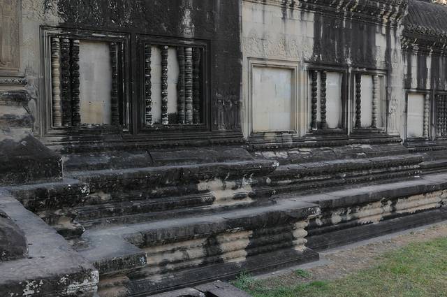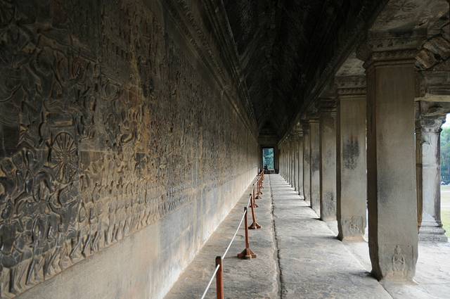 参观吴哥寺只能从西侧进入,吴哥寺是联合国教科文组织负责维修,不同的国家负责修复不同的部位,在吴哥古迹中,这里修复的最好。西侧引道的起始部分是一个大平台,有着很精致的那伽栏杆。西侧的引道穿过190米宽的护城河,每隔一段,都有台阶可以通到护城河边。引道大约靠前的部位有一处脚印的雕刻,用栏杆围着,相传是巴戎寺南大门的阿修罗的足迹。不过实际上据说是后来修复工程时雕刻的作品。