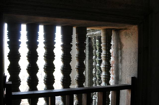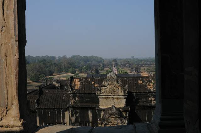 吴哥寺的第三层有五座塔楼与环绕长廊。站在第三层长廊内,回望吴哥寺的引道和下方长廊,感觉真是壮观!尤其是,我们来了四次才最终登上第三层,自然是十分兴奋。连娟娟都来了兴致,拿出她的小相机照个不停。