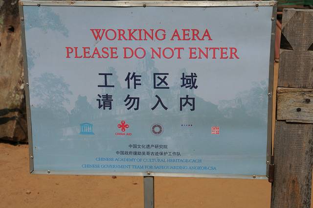 茶胶寺正在维修,我们进去参观时,发现有些区域的标牌上用中英文写着“工作区域,请勿入内”字样,开始觉得有些奇怪,后来想起来,茶胶寺是中国负责维修的寺庙,不禁倍感亲切。
