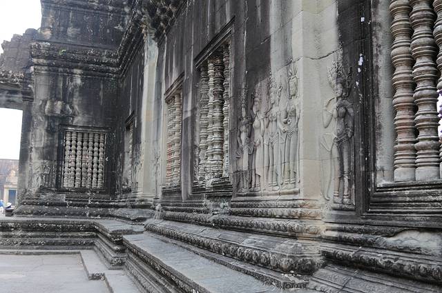 3:30我们启程去吴哥寺,骑车也就十来分钟就到了。上两次来主要看了壁画和三层的雕刻。这次要仔细看看其它的地方了,尤其是墙壁上阿帕撒拉的雕刻。
