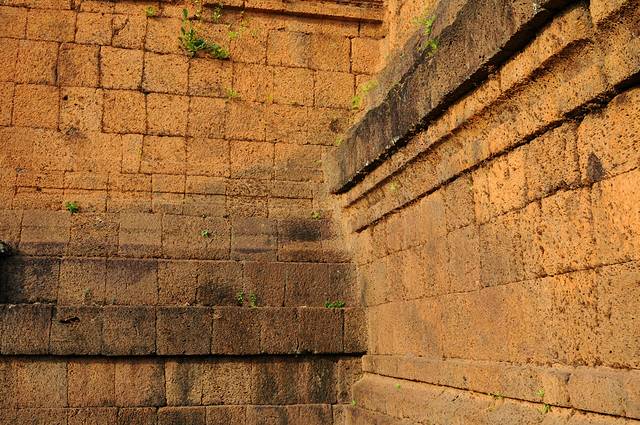 吃完午饭又在饭店里稍事休息,12:30去参观茶胶寺,正是一天中最热的时候,游客也最少。茶胶寺建于10世纪末至11世纪初,由闍耶跋摩五世所建,作为他的国庙。在高棉语里,茶胶寺有 “古老的水晶”的意思,这座寺庙被视为建造吴哥寺的试金石。茶胶寺是吴哥古迹中,第一座完全用砂岩建造的寺庙,可惜没有完工,当年建造结束时,雕刻工作才刚刚开始。这也间接解决了一个疑问,吴哥的建筑是先建造好了,再在上面雕刻。