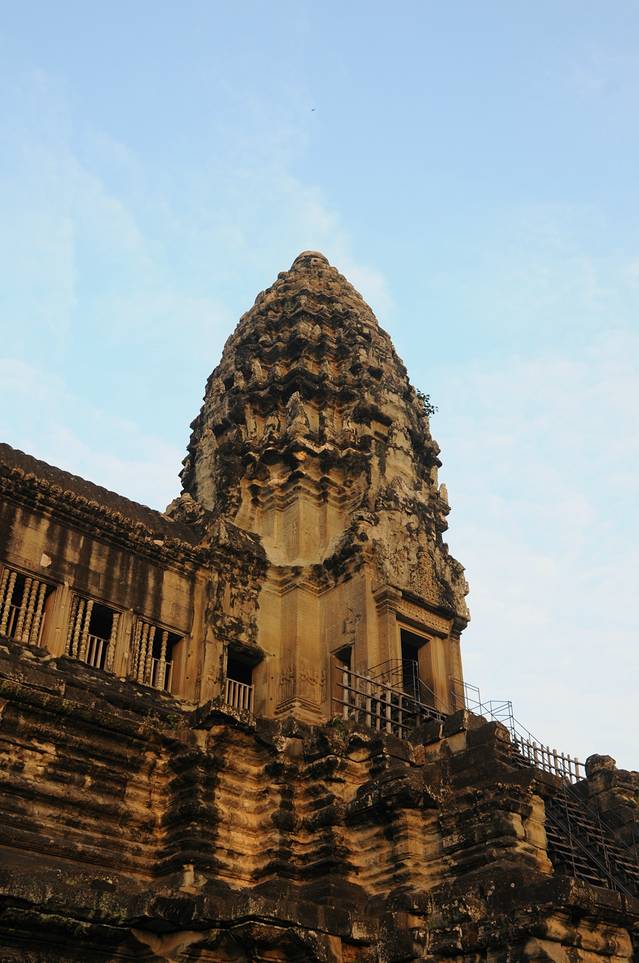 9:20我们骑到吴哥寺,这次我们直奔第三层。今天第三层开放,我们排队从东北侧的木质台阶上去。现在,这段阶梯是通向三层的唯一通道,估计也是从安全角度考虑。这段阶梯确实很陡,大约有50度的样子。上三层要穿过肩过膝的衣服,不建议穿裙子,肯定会走光。