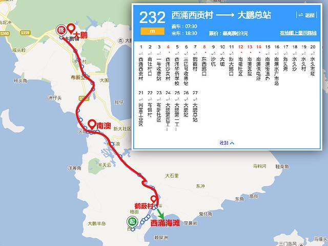 M232公交直达西冲西贡村,大家可以在大鹏始发站上车,也可以在E11的终点站南澳镇上车,后者由于是中途上车,大家要做好没有位子的准备,节假日的话人会稍多一些。