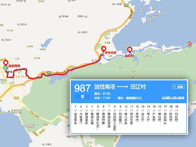 原本987路是直接开到坝光深处的田辽村,而整个坝光里面在改建深圳生物谷,所以公交车现在只开到坝光社区。要去盐灶等比较值得去的村子只能靠步行了,当然自驾除外,坝核(坝光—大亚湾核电区)公路路宽车少,一路风景也不错。