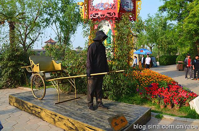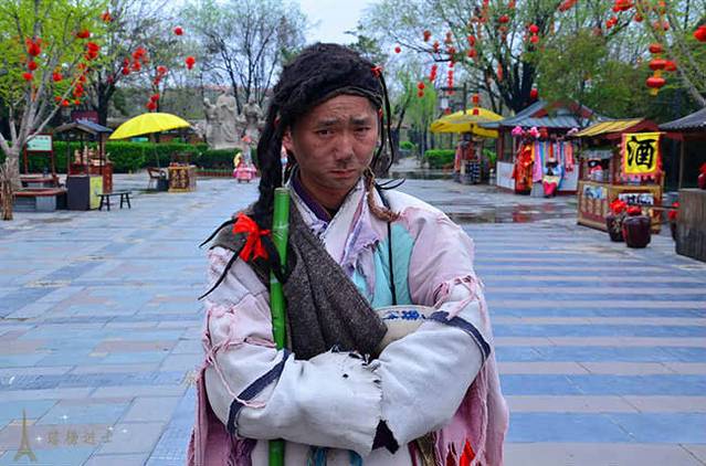 当我进入园中,身临其境的步入了北宋人的生活,领略北宋繁荣时期的盛世景象。整个景区内芳草如茵,古音萦绕,钟鼓阵阵,形成一派“丝柳欲拂面,鳞波映银帆,酒旗随风展,车轿绵如链”的栩栩如生的古风神韵。园中所有的工作人员都是宋朝时期的装饰,其中具有北宋民俗风情和市井文化的剧目表演,非常具有观赏性,而且还可以参与其中。而在众多演员之中,就要属这位丐帮的兄弟表情最为出色了,他受了欺负的样子非常可爱,吸引了很多人和他合影留念。