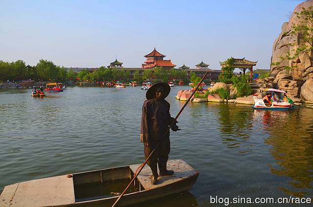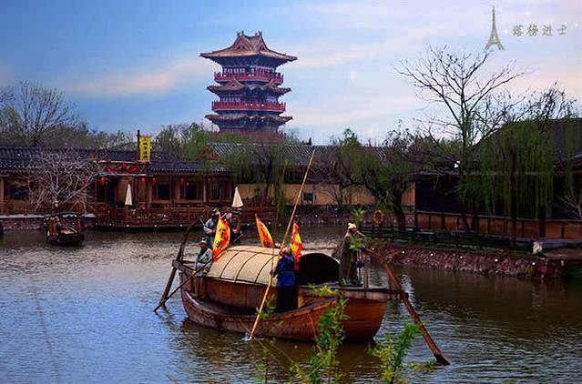 广场中央的池水中浮动着一只造型古朴的宋代木船,船上桅杆高耸,