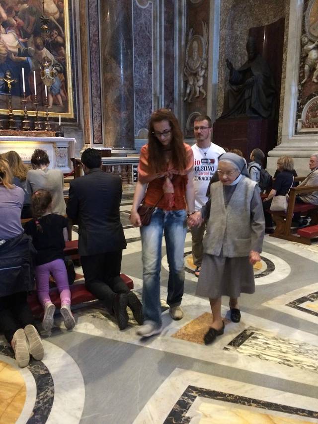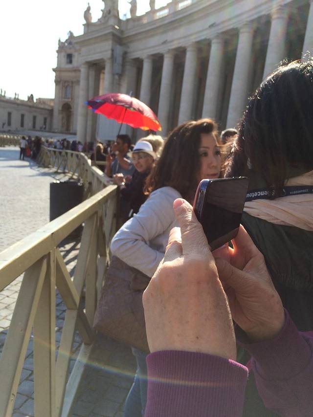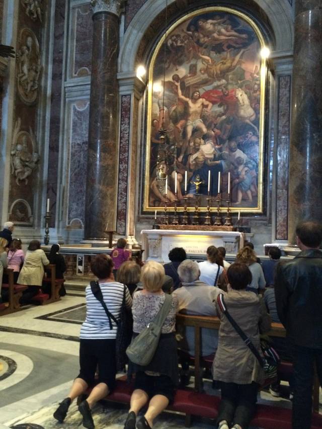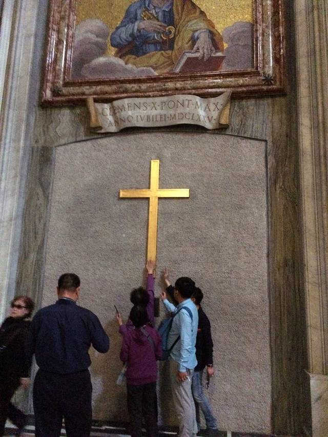 圣彼得广场,地陪导游在带领我们排队。我报了圣彼得教堂的专业讲解,自费30欧。地陪导游给我们发了小接收器,她讲解,我们在8米之内都可以听到。全团34人,报了16人,这16人归她管,过安检超能干不让过的她三两句就OK了。一个个名画石雕,要点都讲的非常清楚。剩下的人自己看,那绝对是看个热闹。这个自费报的最值。