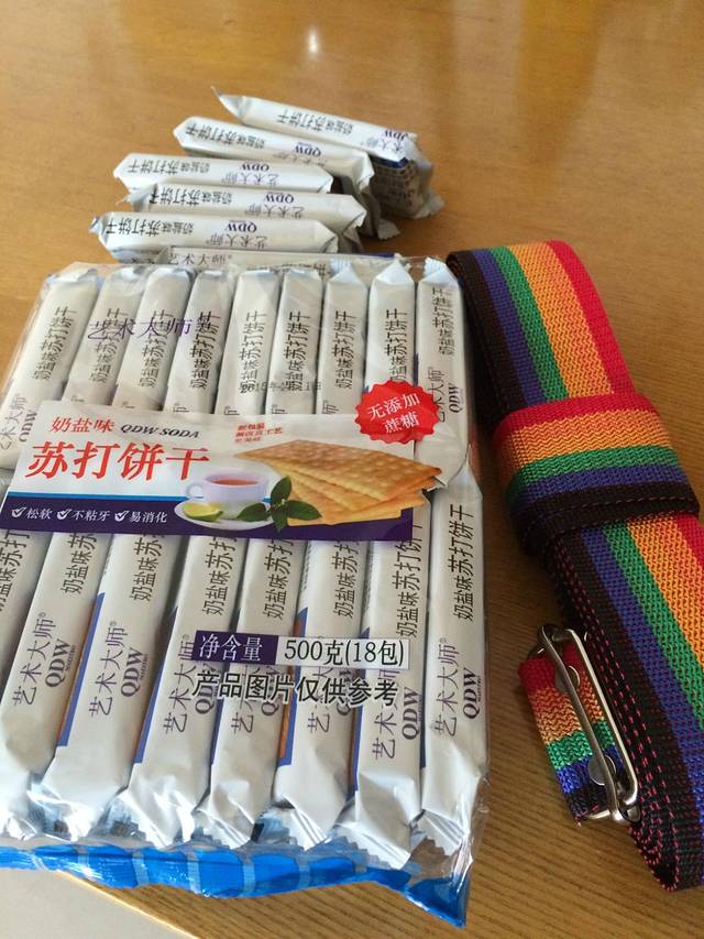 小包装饼干非常方便,旅游时饭点不固定,随时拿出来吃一包。包装带打在行李上,除了防摔,还有非常显眼。行李托运时从转盘一出来就看见了。