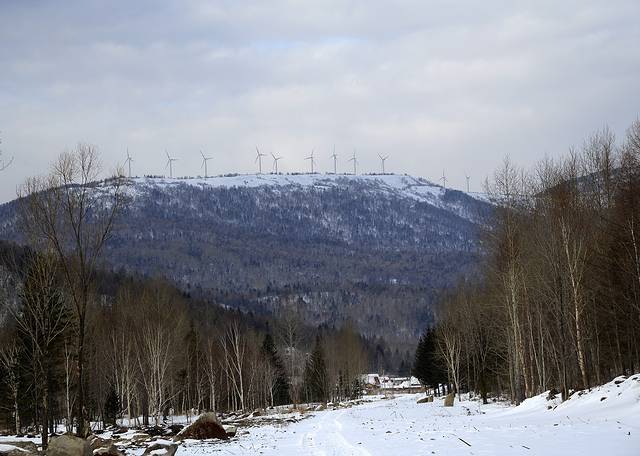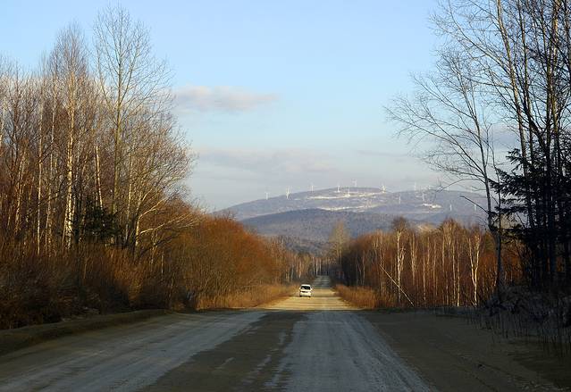 风车山不是一个官方的名称,甚至不是一个很通用的名称,这里实际上是海林中电海浪风力发电有限公司的所在地。因为山上有成片的风车,刘爽把它称为风车山,我们也就跟着叫了。从我们住的地方往亚布力方向开,大约开13公里分路,去风电厂方向,里程表2736公里。这个分岔路口昨天我们开过来时挺明显的,但是往回开时却比较容易错过。车上五个人除了娟娟都瞪大眼睛看,总算顺利地找到了。