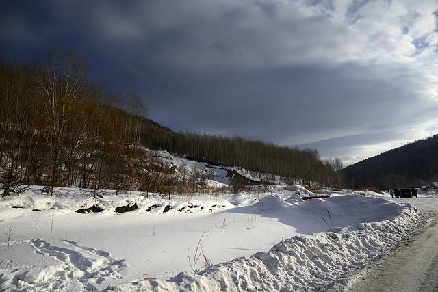 刚出村子没多远,9:40左右,我们看见一辆轿车整个陷到了雪里。几个大人在铲雪,旁边还有两个孩子。这我们当然不能袖手旁观,开过去帮他们拖车。他们是租车自驾,拐弯的时候没控制住。这次我们用上了20吨的拖车绳和沙板,我们的车不是雪地胎,一直打滑,好在路比较宽,不至于出问题,最后总算把车给拽出来了。